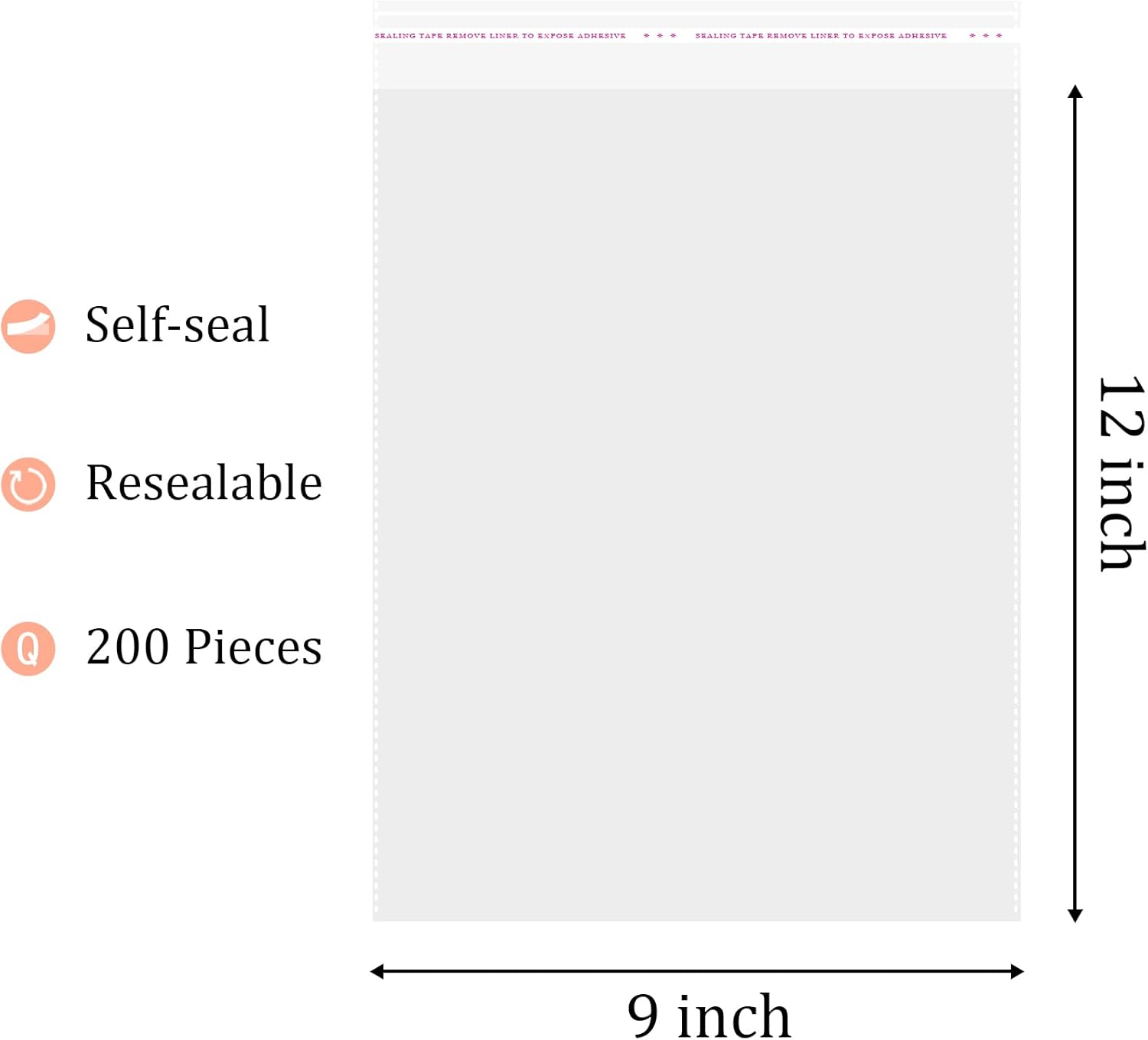 Morepack Large Self Sealing Cellophane Bags Self Adhesive,9×12 Inches Clear Resealable Cellophane Plastic Bags for Packaging Clothes, T-shirts, Pants,200 Pieces