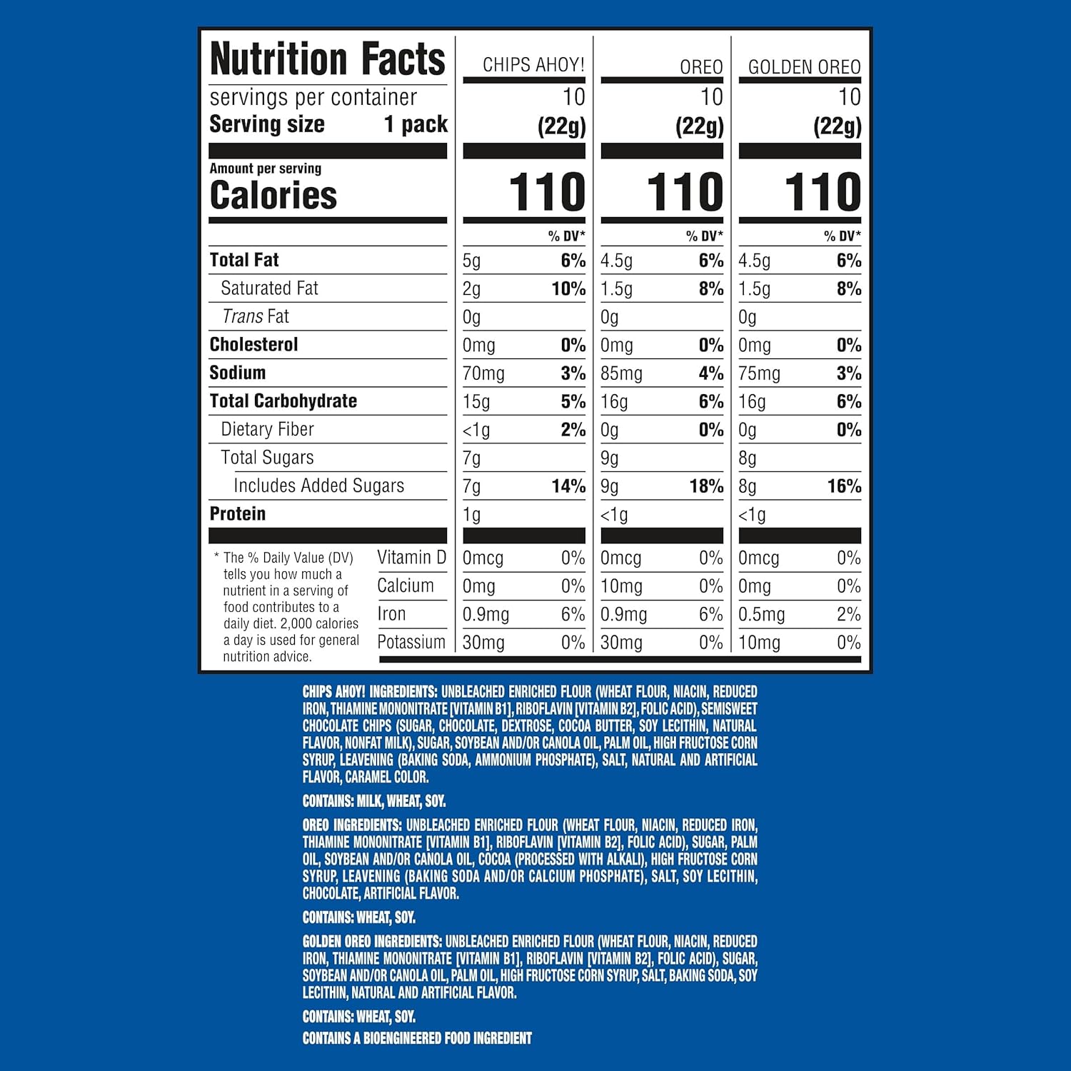 This Sweet Treats Cookie Variety Pack includes OREO Original cookies, OREO Golden cookies and CHIPS AHOY! chocolate chip cookies in convenient snack packs for freshness and perfect portions. OREO cookies have the same original creme filling, and OREO Golden cookies offer a fun, vanilla take on the classic sandwich cookies. CHIPS AHOY! chocolate chip cookies are filled with crunchy goodness for a sweet treat. Tuck these snack packs into your lunch for a fun dessert, or reach for these snack size cookies when you’re ready to unwind from the day. They also make great holiday favors, stocking stuffers, Easter basket fillers, Halloween treats, school snacks, snack variety packs for adults and sweet snacks for the team after the big game. Each individually wrapped cookie pack includes two cookies, just the right amount to satisfy your sweet tooth. This cookie pack of variety snacks includes 30 individual snacks for easy storage and convenient transport.