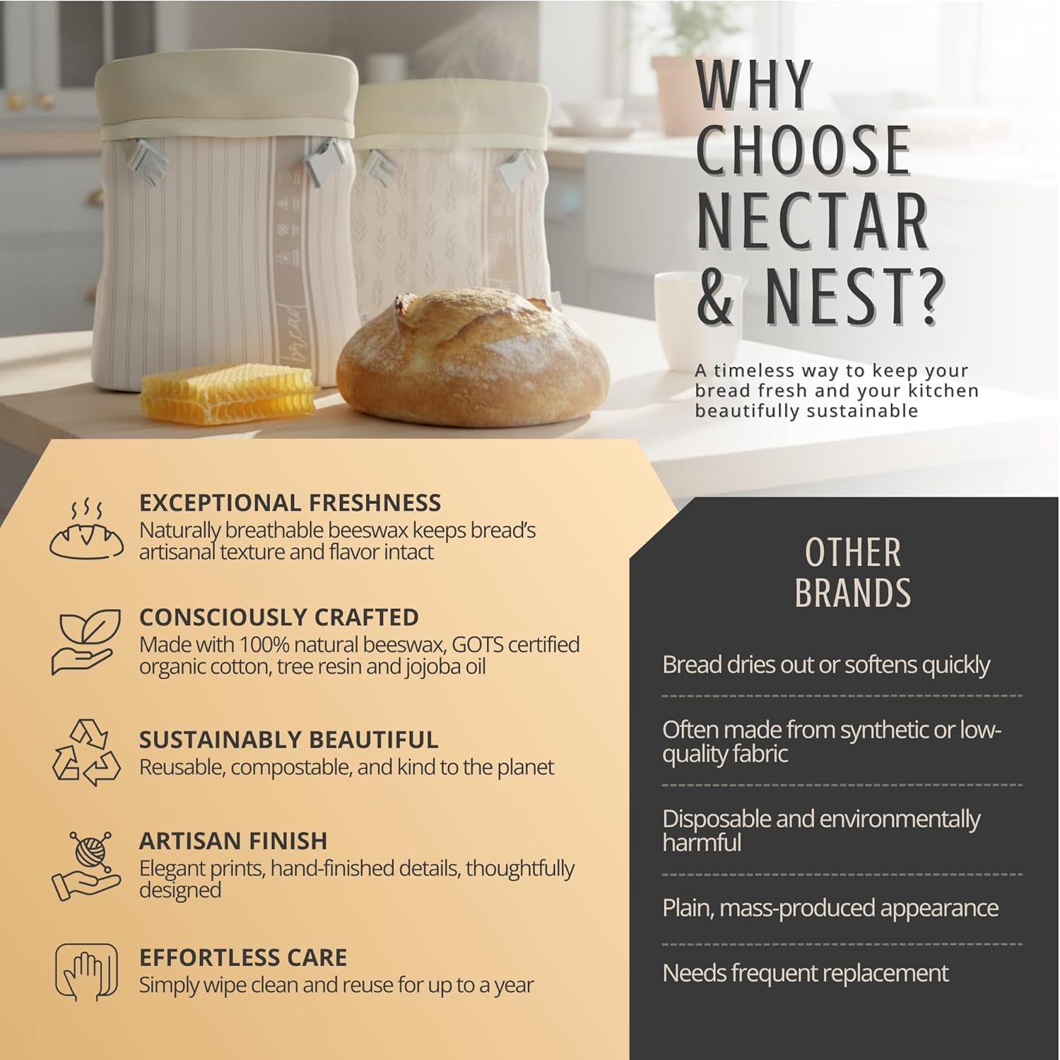 Nectar & Nest Reusable Beeswax Bread Bags for Homemade Bread & Sourdough – XL Eco-Friendly, Natural, Food-Safe Storage Bag to Keep Loaves Fresh Longer – Sustainable, Zero Waste