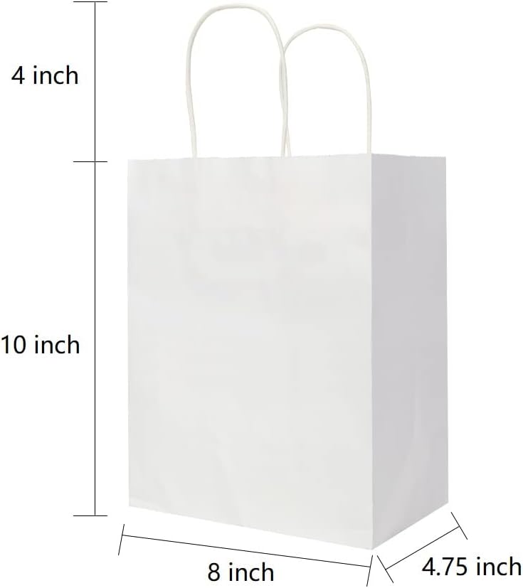 Oikss 100 Pack 8×4.75×10 Inch Medium White Kraft Paper Bags with Handles Bulk for Birthday Wedding Party Favors Grocery Retail Shopping Business Takeout Goody Craft Gift Bags Sacks, (100pcs Count)