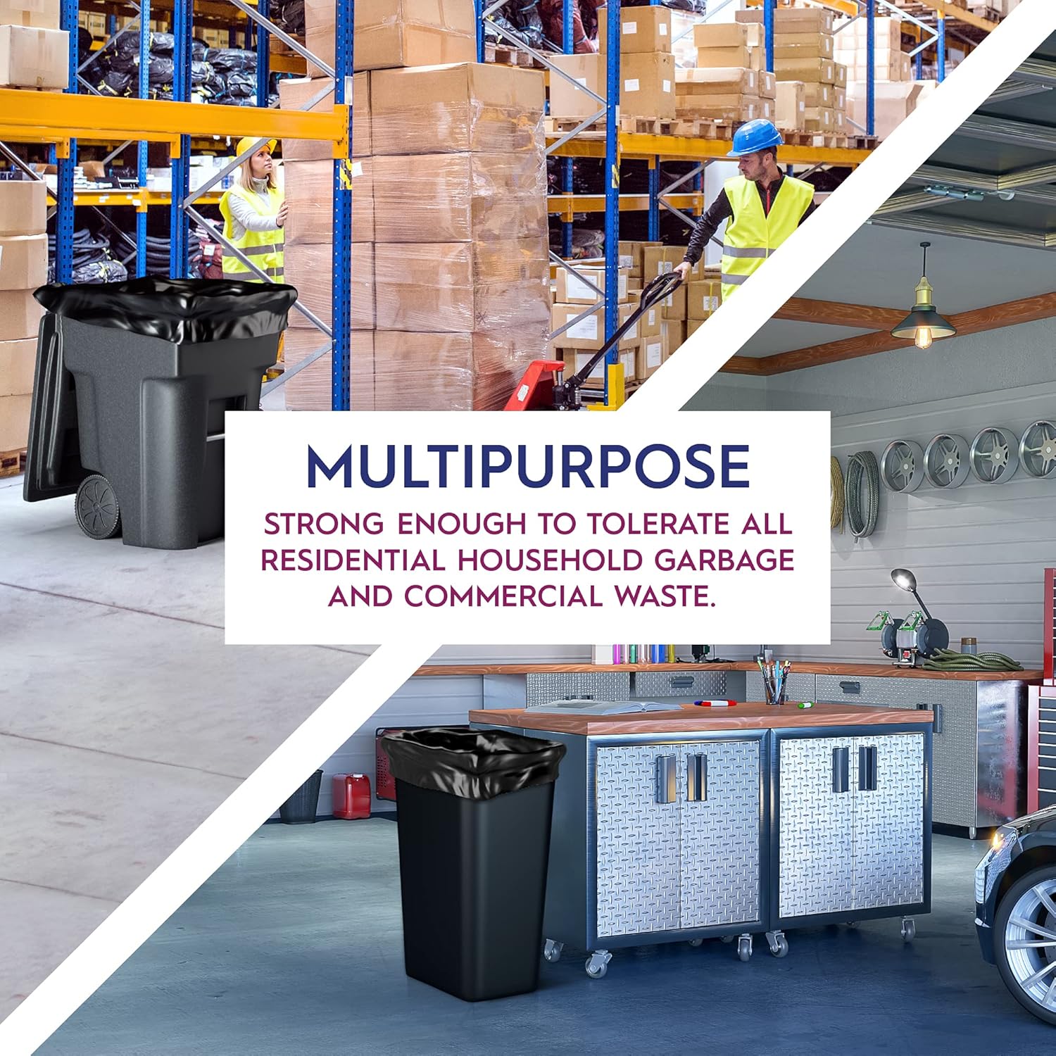Multipurpose Garbage Bags for Any Job: These black plastic bags are not only ideal for kitchen and home cleanup, they also provide an affordable alternative to plastic bins. Fill these heavy duty trash bags with lumber, drywall, glass, or freshly trimmed branches without fear of splitting.