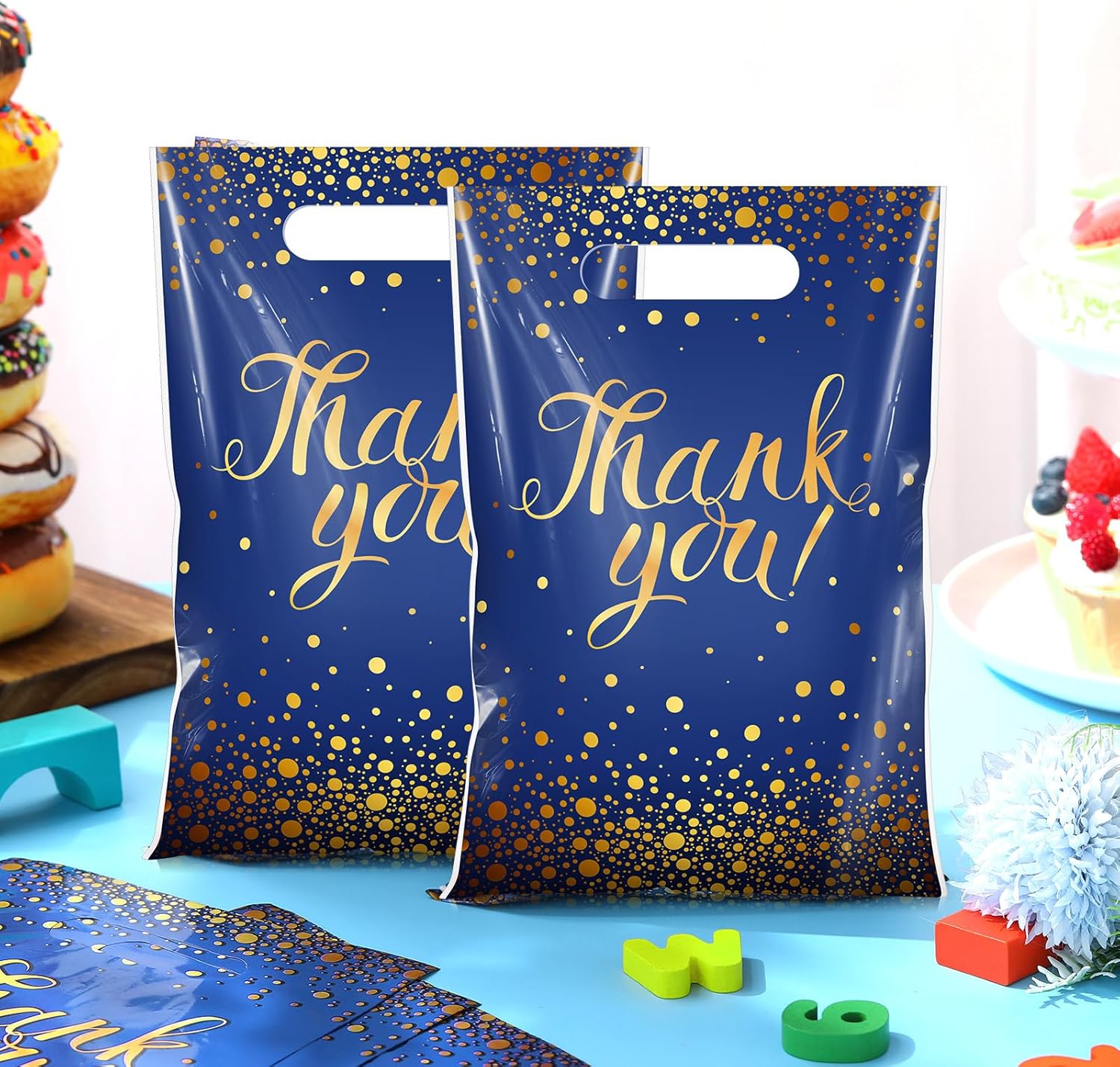 Thank You Gift Bags Bulk: package includes 100 pcs blue and gold plastic bags with handles; Sufficient quantity and fashionable style are suitable for gifts packaging on various occasions or daily use to express gratitude, adding happy atmosphere and attracting guests’ attention