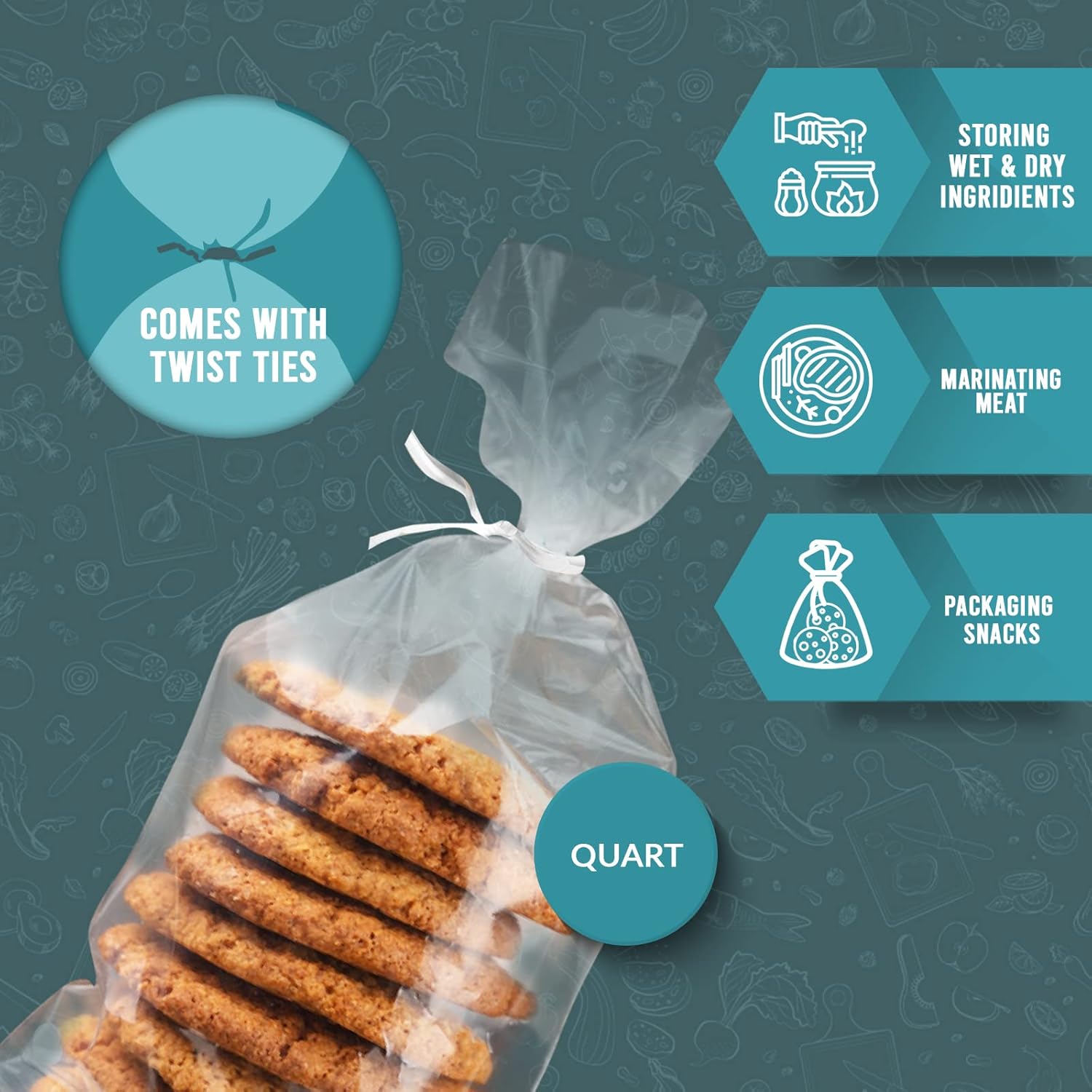 CONVENIENCE: Experience the convenience of our plastic food bags with twist ties, designed to keep your food fresh and well-organized. Perfect for storing any dry or wet ingredients, these twist tie baggies come with easy closure and hassle- re-opening.