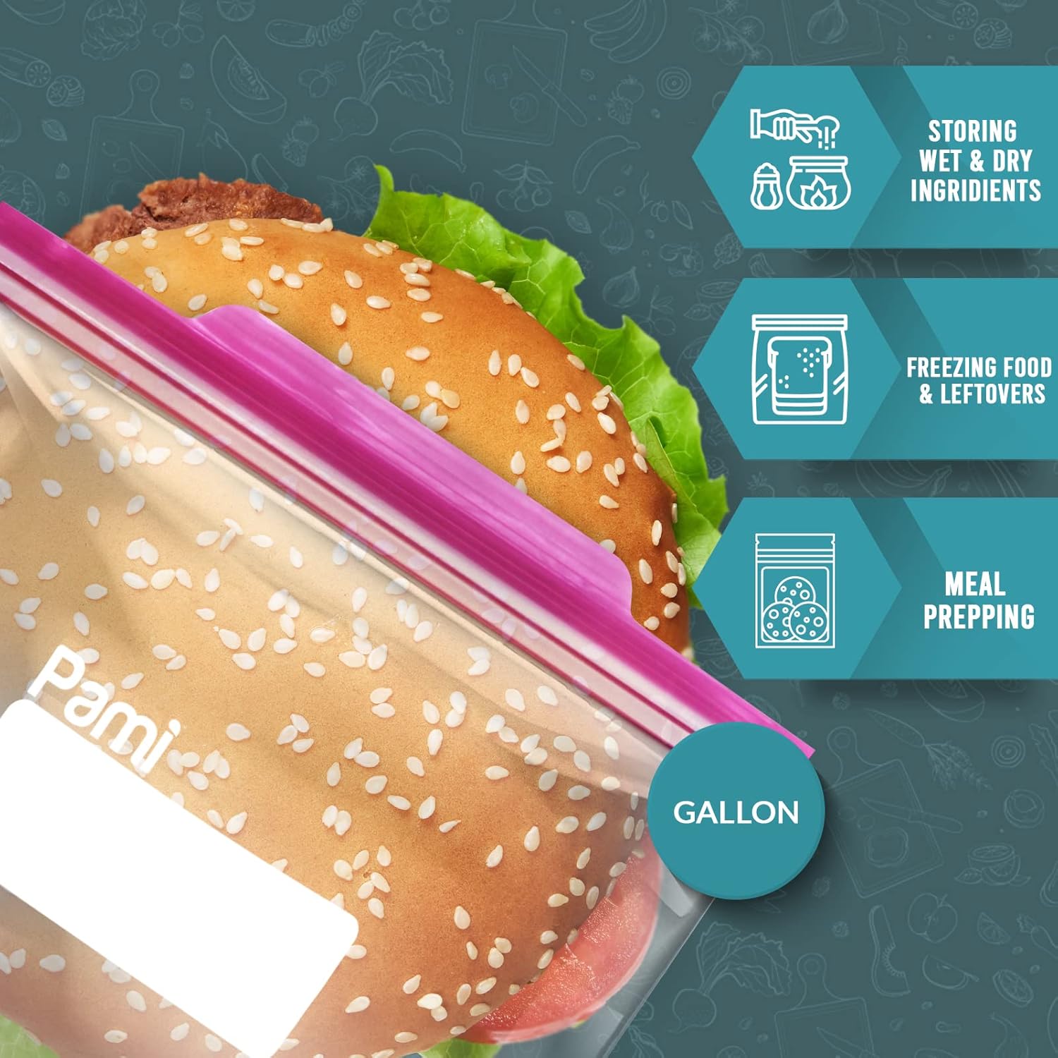 DOUBLE ZIP: PAMI Double Zip Food Storage Gallon Bags are your key to unlocking a well-organized kitchen. These gallon bags are designed with a robust double zipper closure, eliminating the need for complicated knots and preventing messy leaks. Perfect for storing both dry and wet ingredients, these reusable gallon freezer bags also feature a designated write-on label for noting down important details.