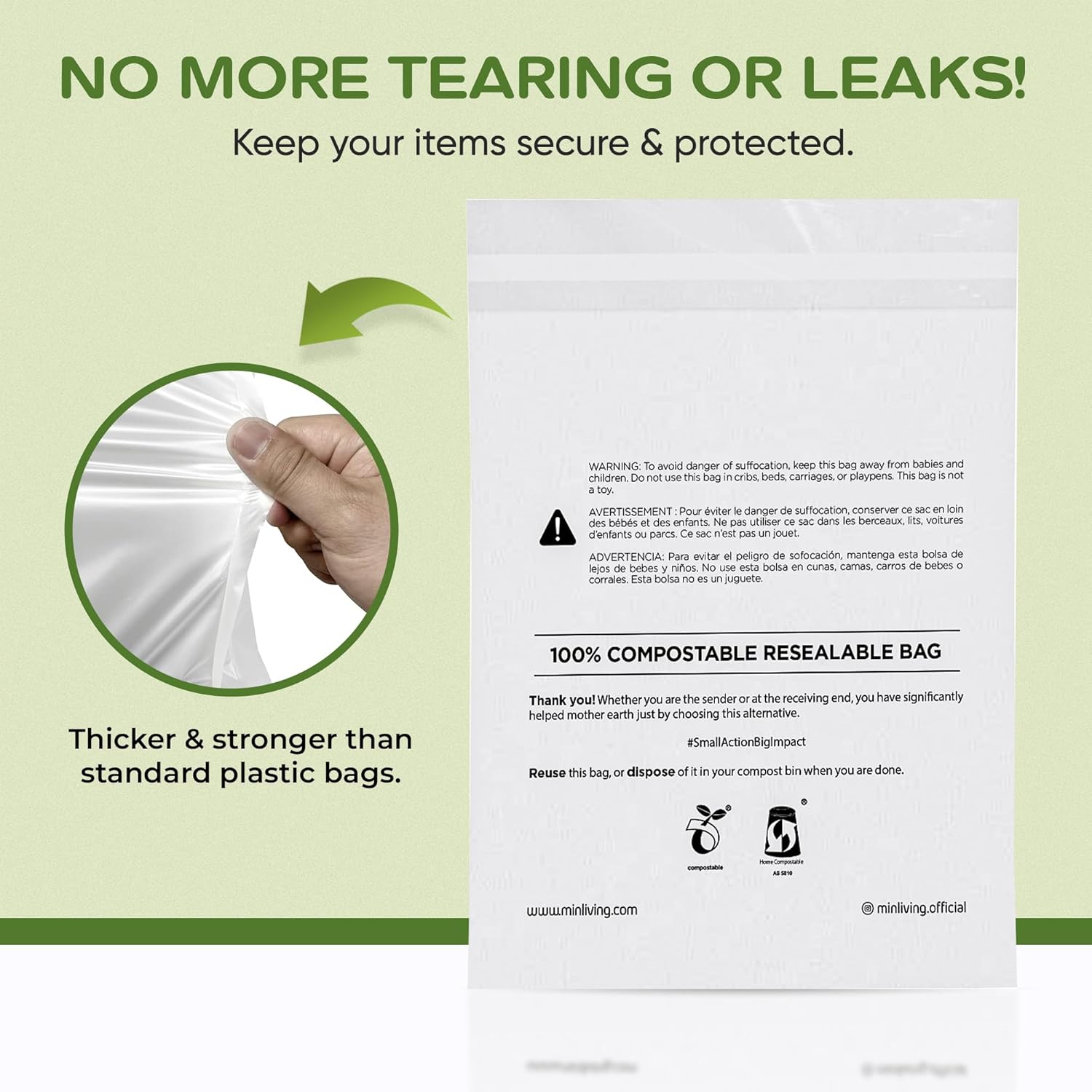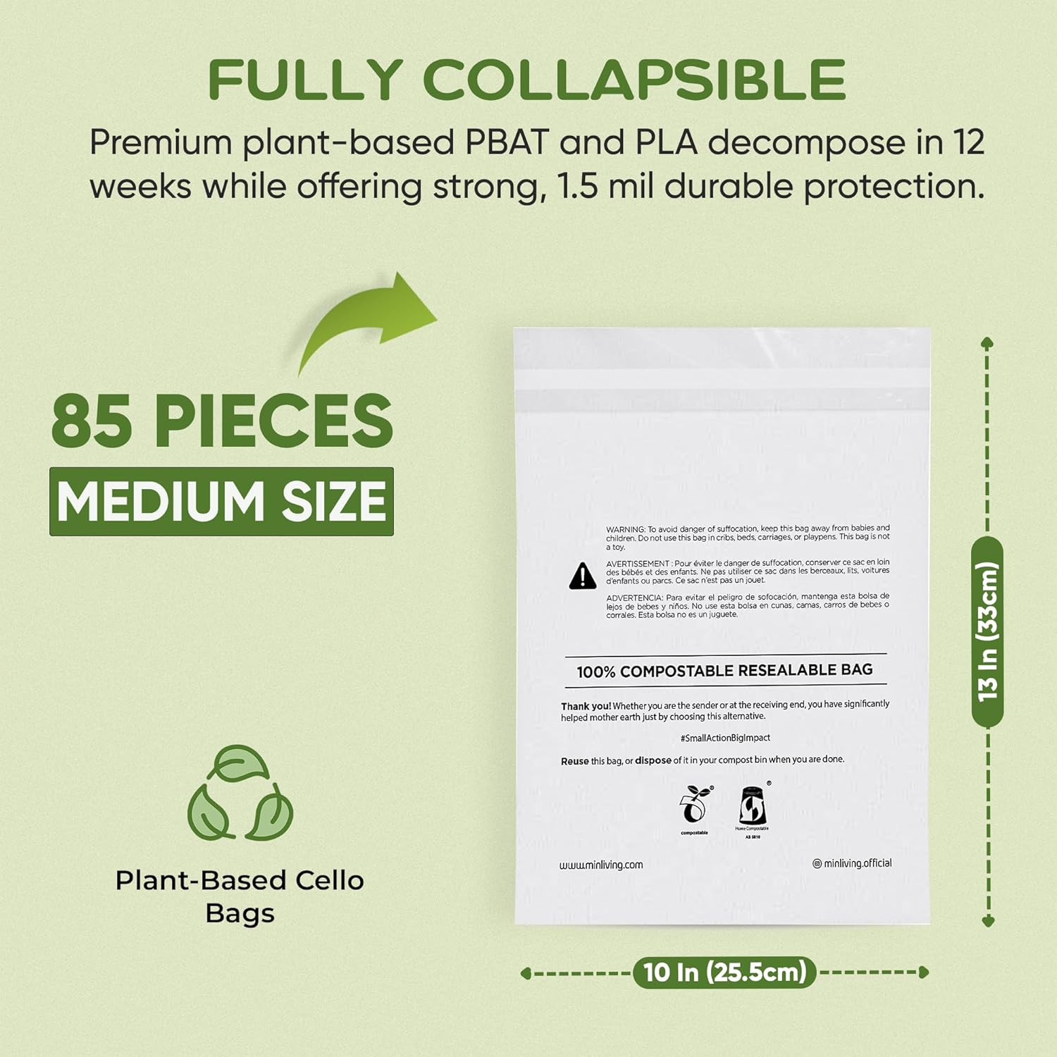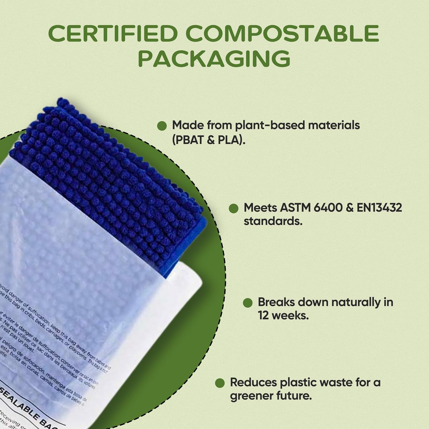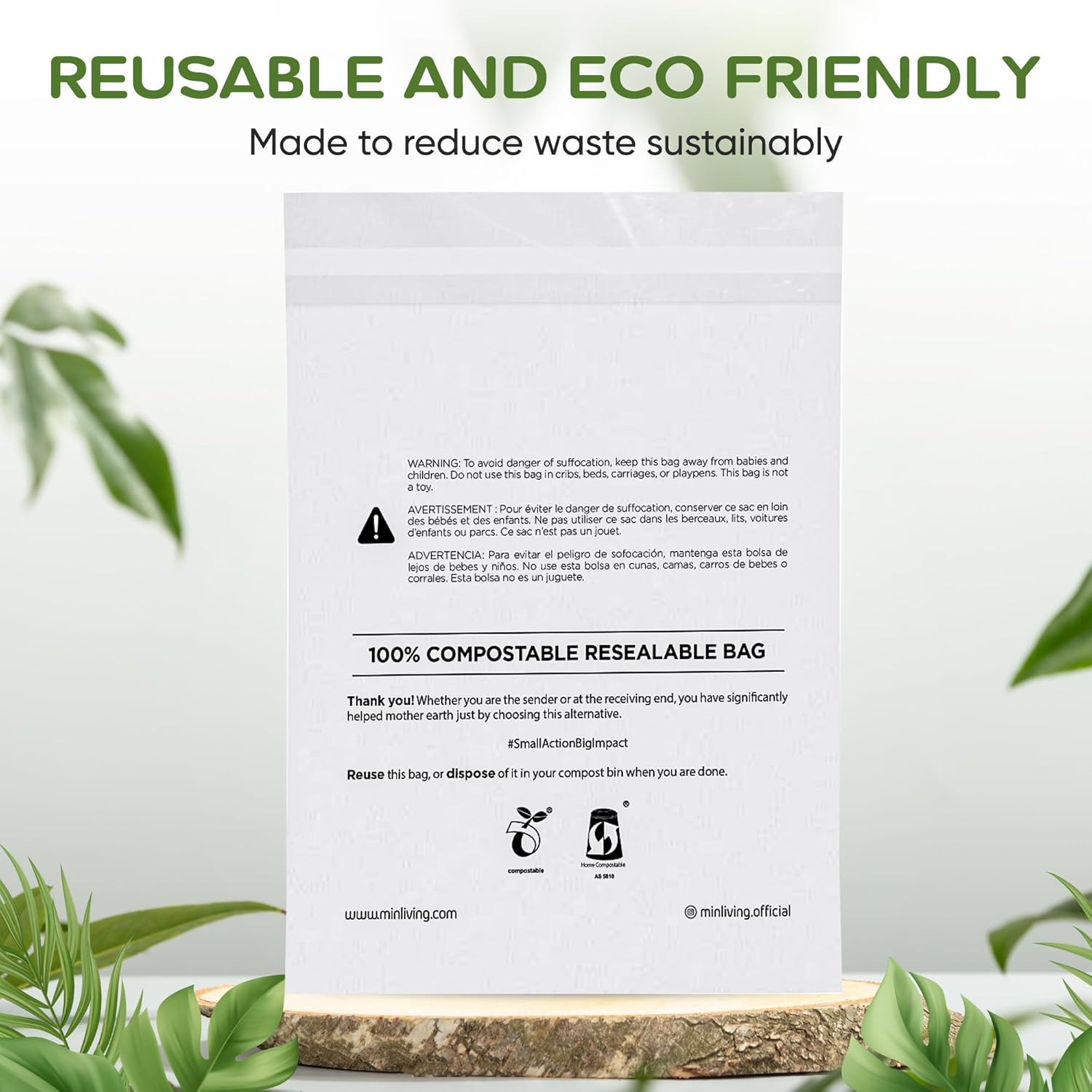 CERTIFIED SUSTAINABLE: Trust in global certifications ASTM 6400 and EN13432 for industrial and home composting. Includes required multilingual suffocation warnings meeting all FBA marketplace requirements.