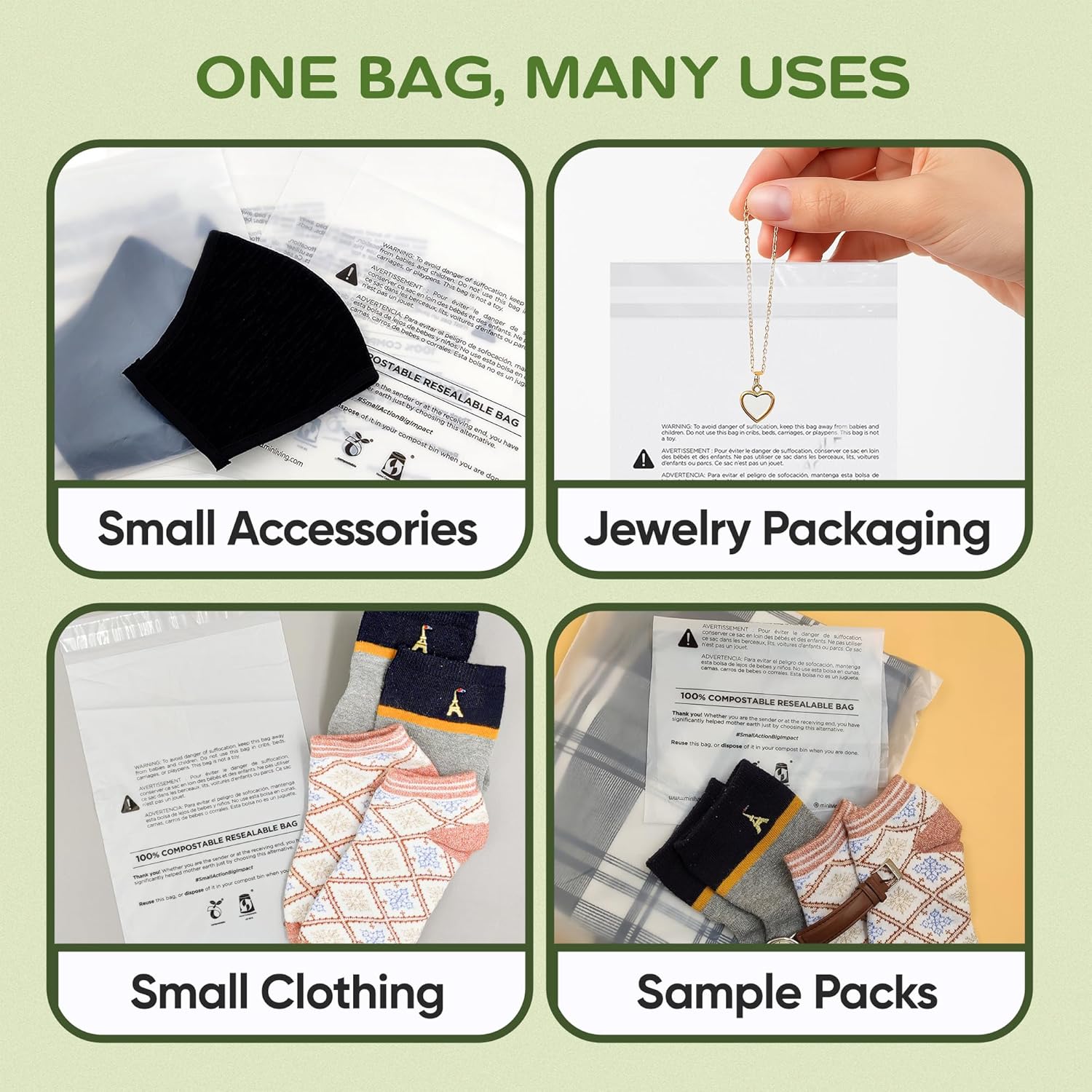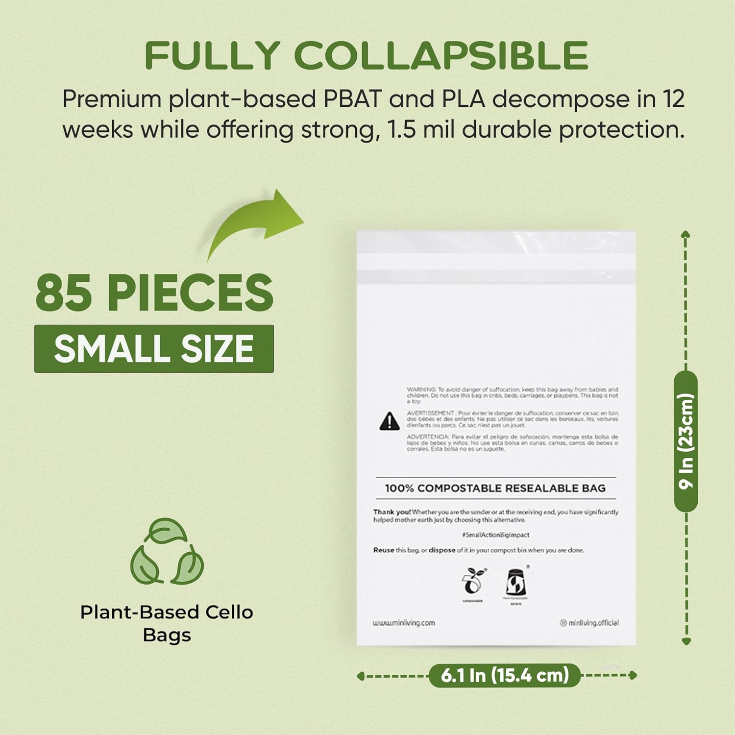Plant-Based Cello Bags, 85 Count Compostable Storage Bags, Self-Sealing Translucent Frosted Bag for Clothes Snacks Cosmetics, Biodegradable Packaging with Resealable Closure, Small (6×9)