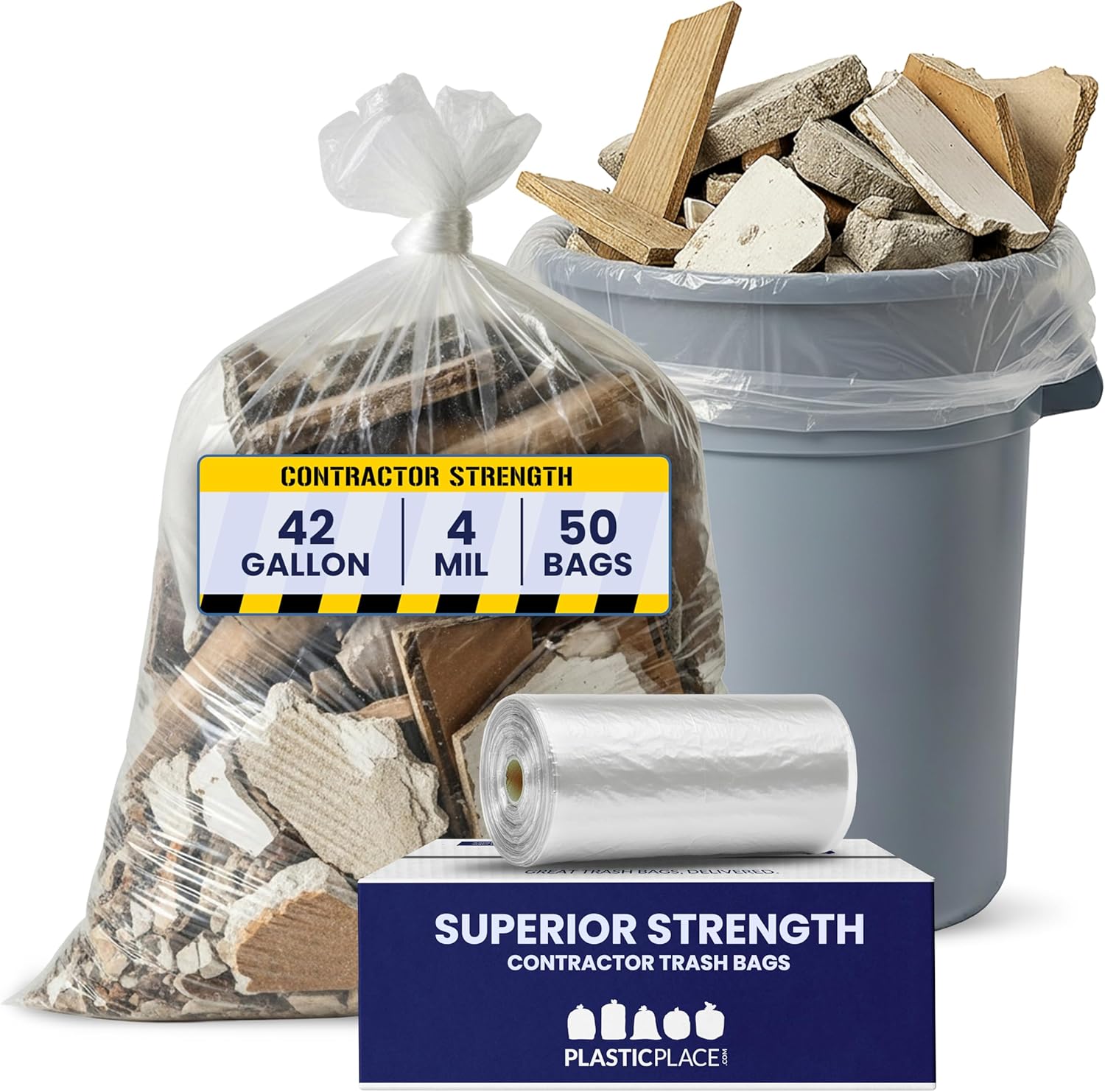 Plasticplace 42 Gallon Contractor Trash Bags │ 4.0 Mil │Clear Heavy Duty Garbage Bags │ 33″ x 48″ (50 Case)