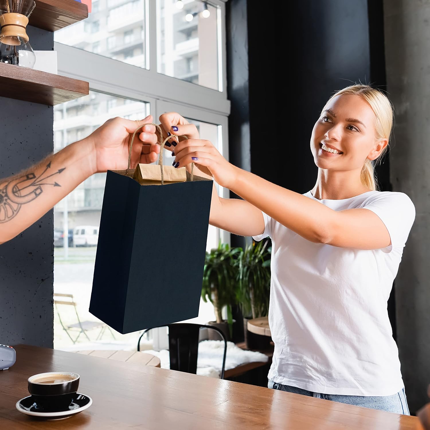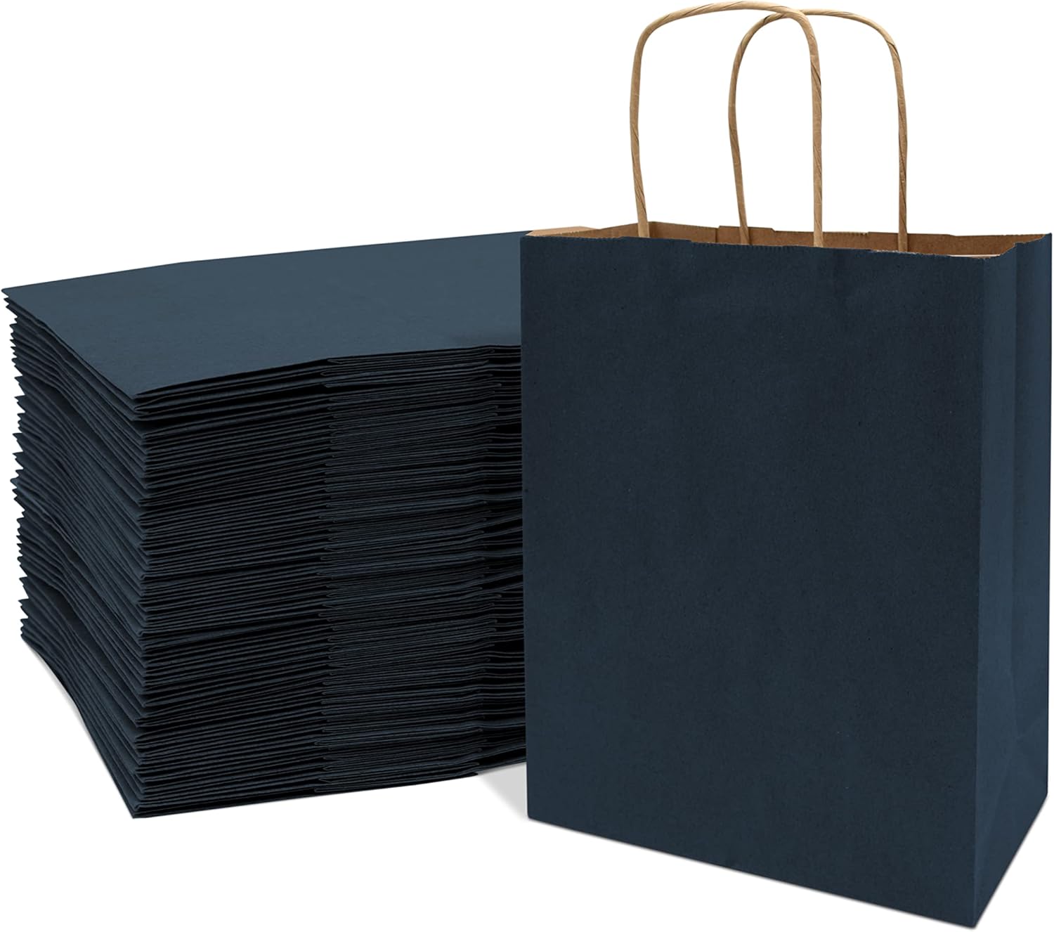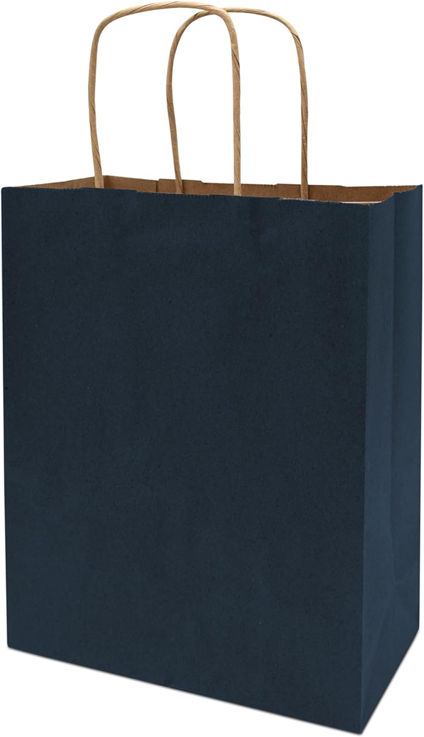 CONSTRUCTION – These bags are made from FSC Certified recyclable 120 GSM navy blue kraft paper capable of holding a weight of up to 9 LBS. Each bag measures 8″ wide by 4″ deep by 10″ tall. Our small-sized gift bags are made to be sturdy and durable, with matching patch reinforced paper twist handles and a squared bottom for easy loading and unloading. Each bag can hold several pounds each, making them perfect for both shopping and takeout needs alike.