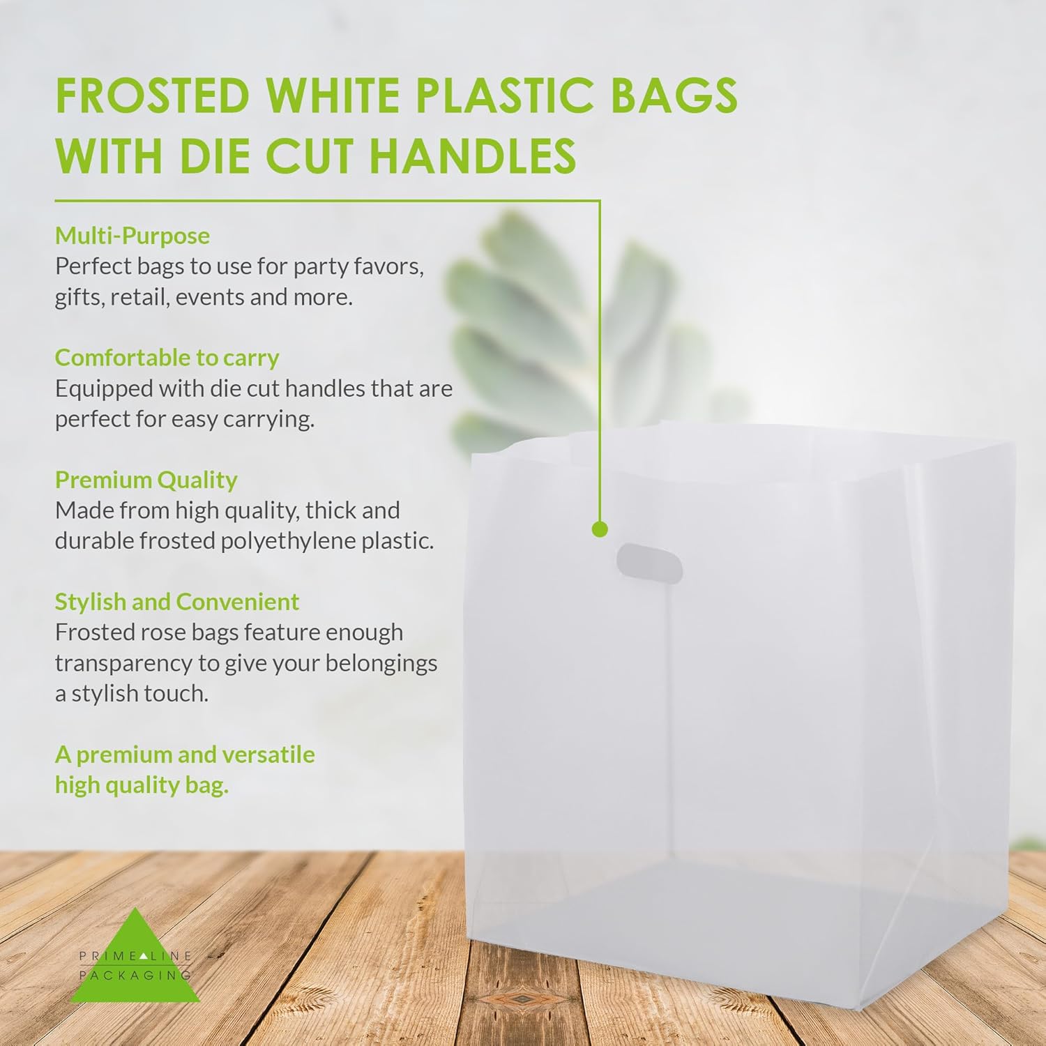 Made by Prime Line Packaging, our frosted white semi clear plastic die cut takeout bags are the perfect ergonomic option for bakeries, delis, restaurants, coffee shops, farmer’s markets, convenience stores, and small businesses. Coming in bulk packs of 100 and measuring 13″ wide by 10″ deep by 15″ tall, each bag is crafted from 2.5 Mil plastic. Prime Line Packaging’s to go bags are the perfect solution to use as disposable lunch bags, takeout and delivery bags, simple grocery bags, and every day, over-the-counter merchandise bags for small businesses, boutiques, and convenience stores. Each bag is large enough to hold bread, sandwiches, pastries, bottles, cans, produce, takeout containers, and a variety of other products, making them the perfect durable solution. Our plastic bags can also be used by individuals for events, trade shows, conventions, flea markets and more, making for a resourceful option to carry a variety of small items including accessories, jewelry, collectibles, cosmetics, and other merchandise items. Each bag is constructed with a squared, cardboard reinforced bottom for easy standup and added stability and structure, ensuring that anything placed inside remains secure. Frosted plastic adds an aesthetic touch that also doubles in giving a sense of privacy to its contents, while the plastic bag itself can protect its contents from the elements paper wouldn’t. Each die cut frosted bag is versatile enough to meet the needs of any occasion, including disposable lunch bags, food service industry bags, small retailer bags, take-out order bags and catering bags. Regardless of your needs, the design of these bags and their durable, high capacity brings a variety of uses to a traditional staple of paper bag.