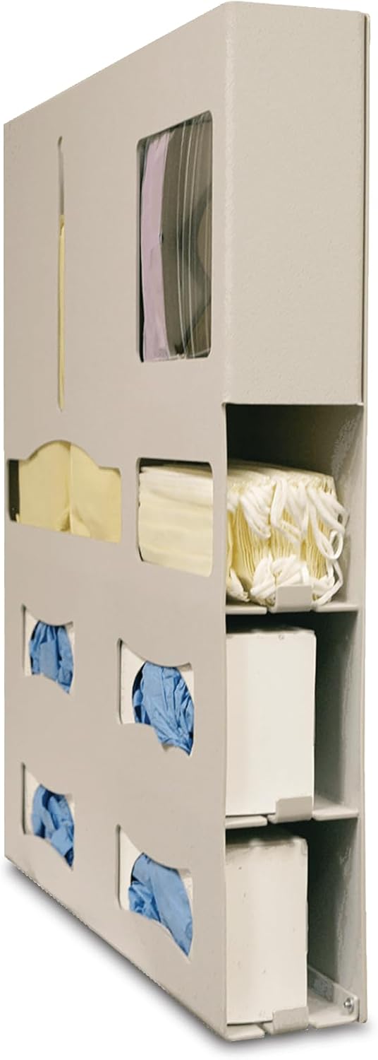 Protective Wear Organizer-4″ -Quad Glove Holds Gowns or Coveralls, 4 Glove, 1 Earloop & 1 Shield mask 4″ Wall Protrusion Compliant Wall Mount or on a Bowman® Hanger Dims: 4”L x 23.37”W x 26.63”H