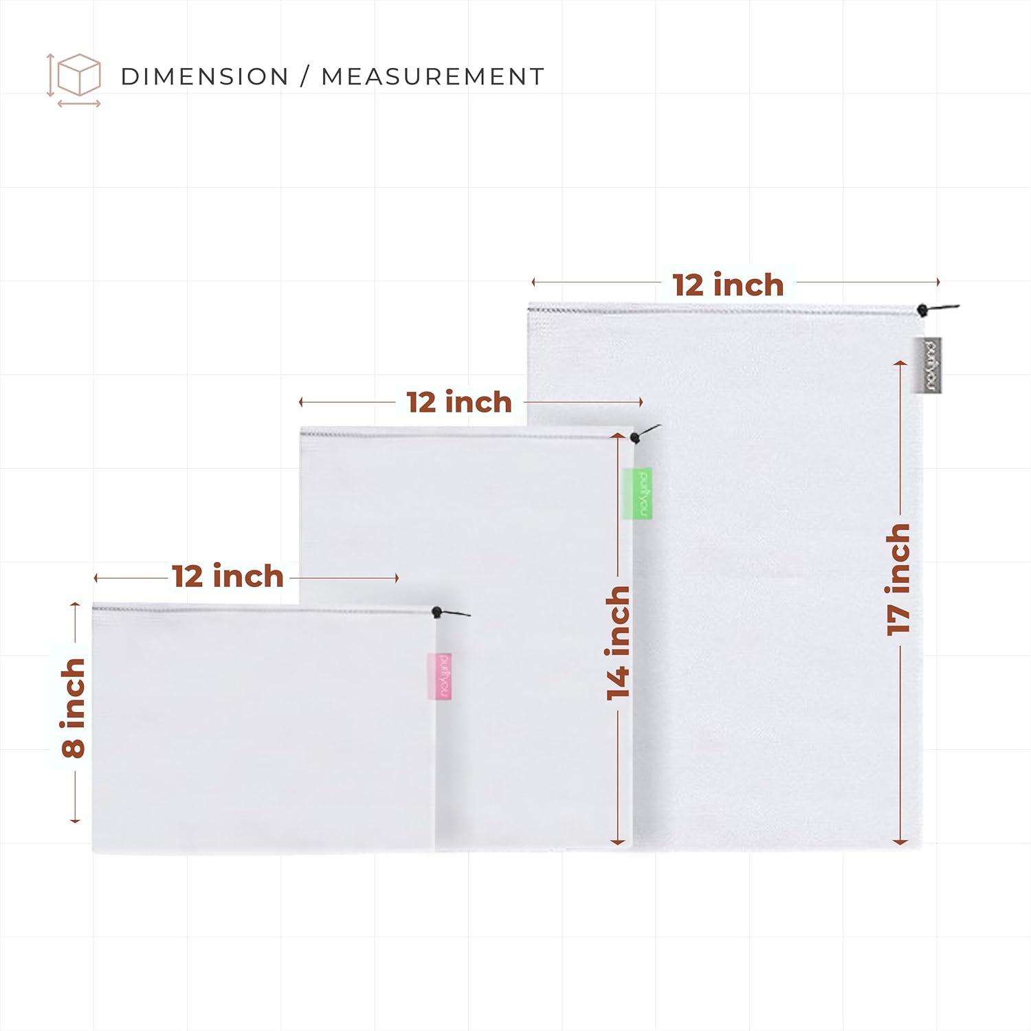 Multi-Size Produce Bags Set: Includes five large (12 x 14 in), two extra-large (12 x 17 in), and two small (12 x 8 in) reusable vegetable bags