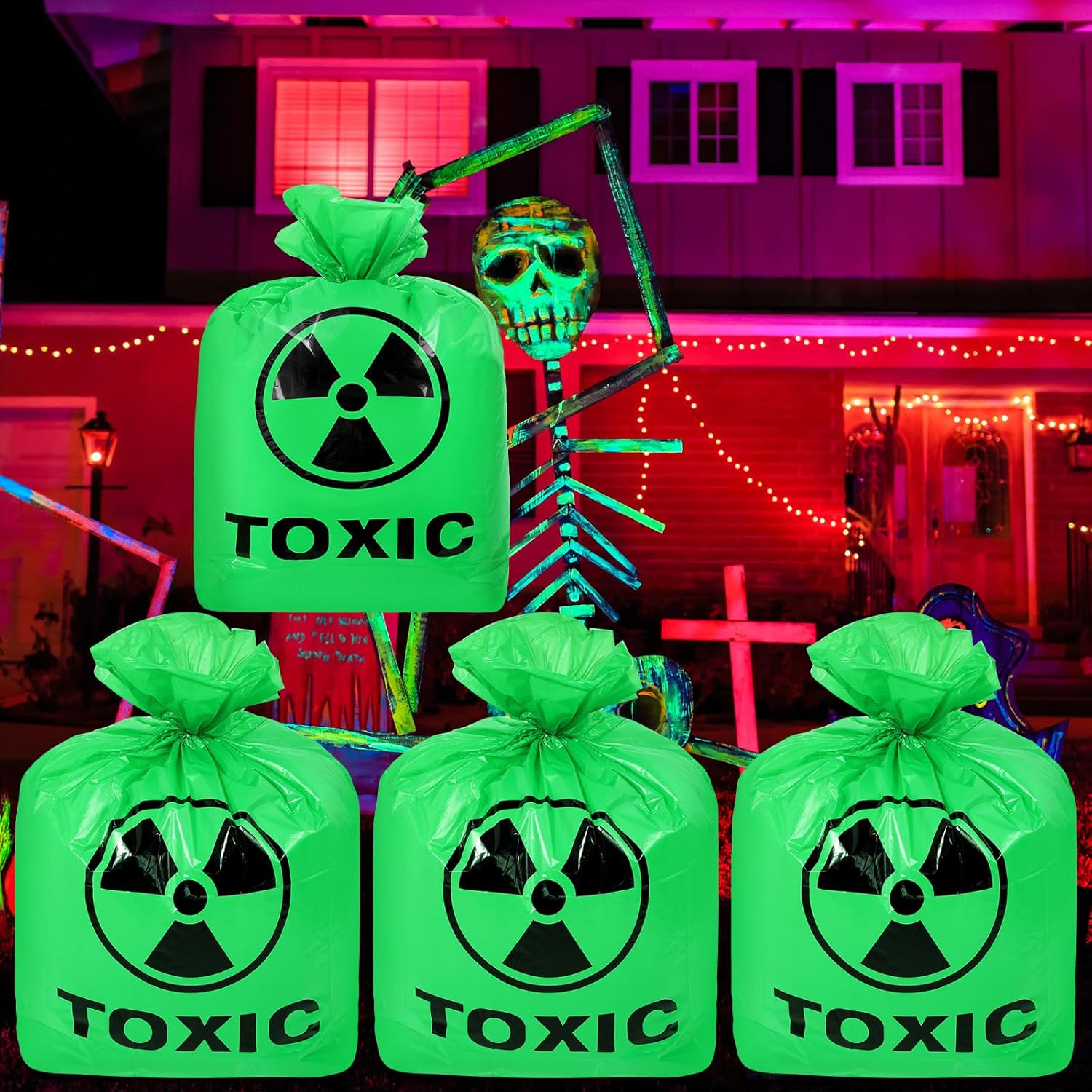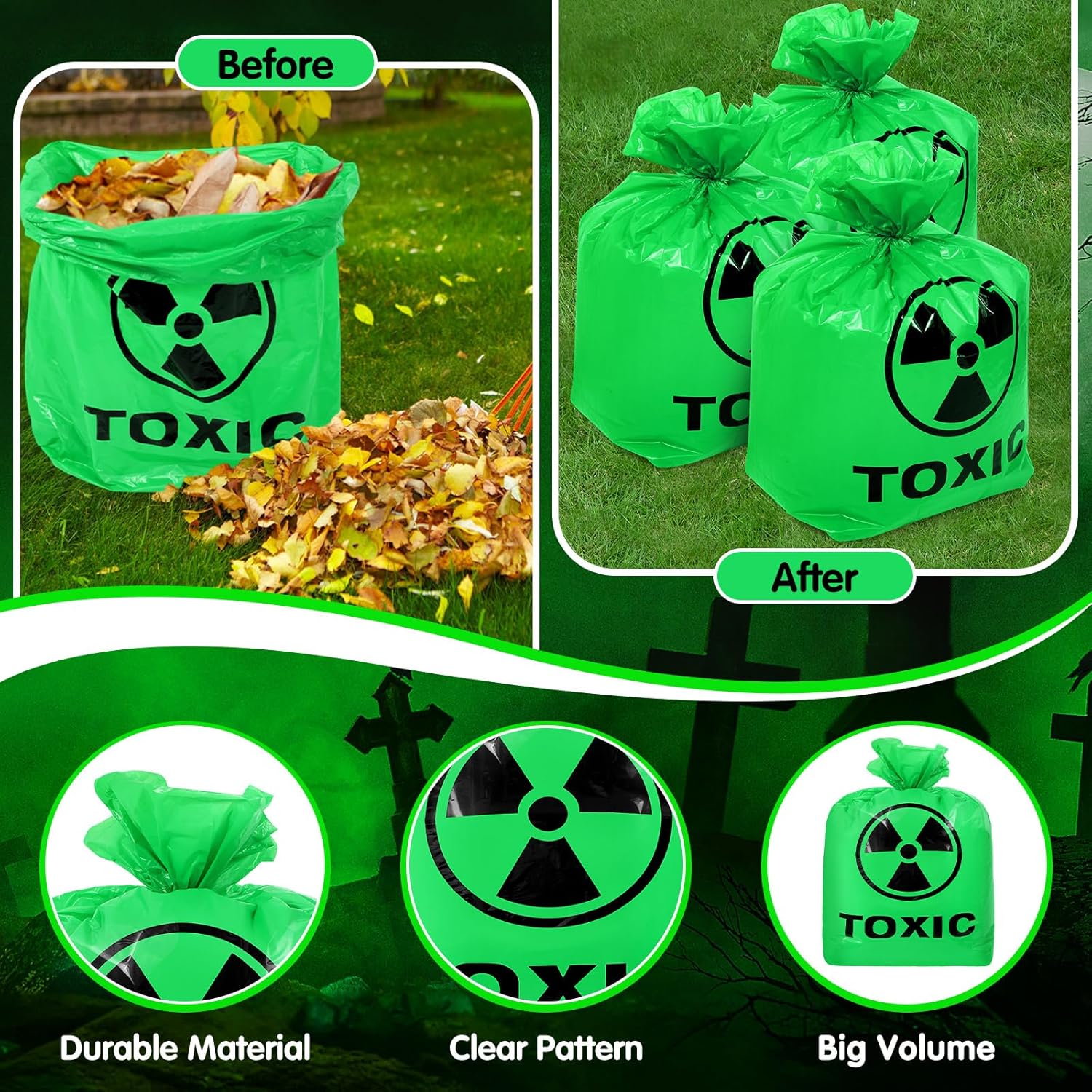 Eye-catching design: These Halloween leaf bags are designed with Halloween patterns, and the English word “TOXIC” is printed on the venomous green lawn leaf bags; These bags are suitable for indoor and outdoor use, more suitable for your Halloween party, your friends will definitely be scared by it