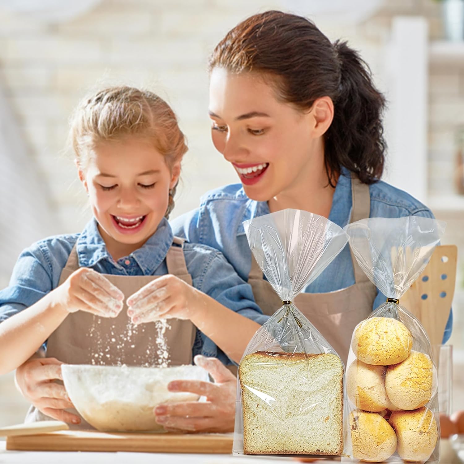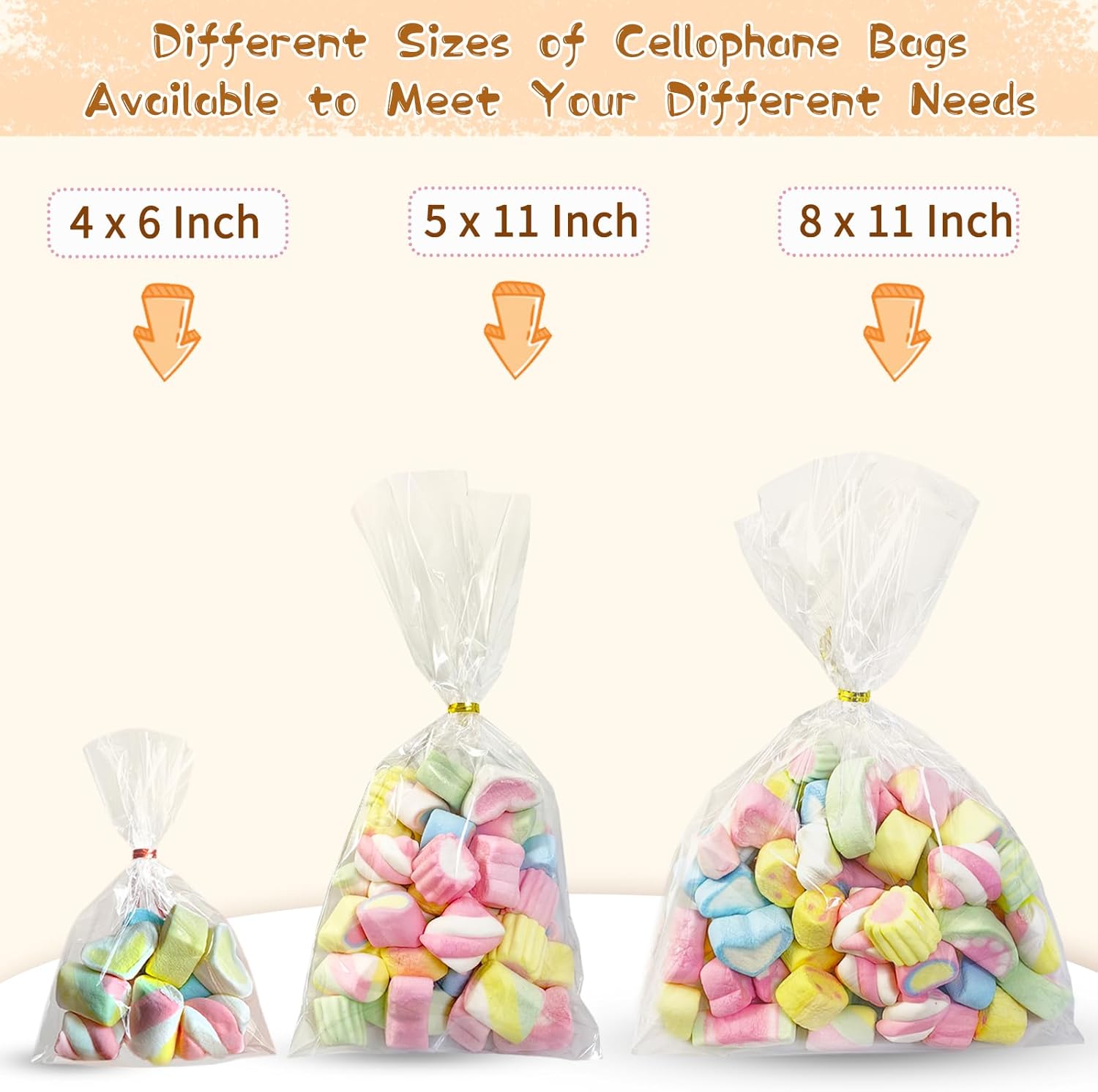 Quantity:100 Clear Cellophane Treat Bags Size:11×5.3 inches Accessories:110PCS Gold Twist Ties Material Excellence: Our treat bags are made with high-quality plastic, ensuring outstanding clarity to showcase your treats with style. The material is chosen for its premium quality, making these bags durable and visually appealing.