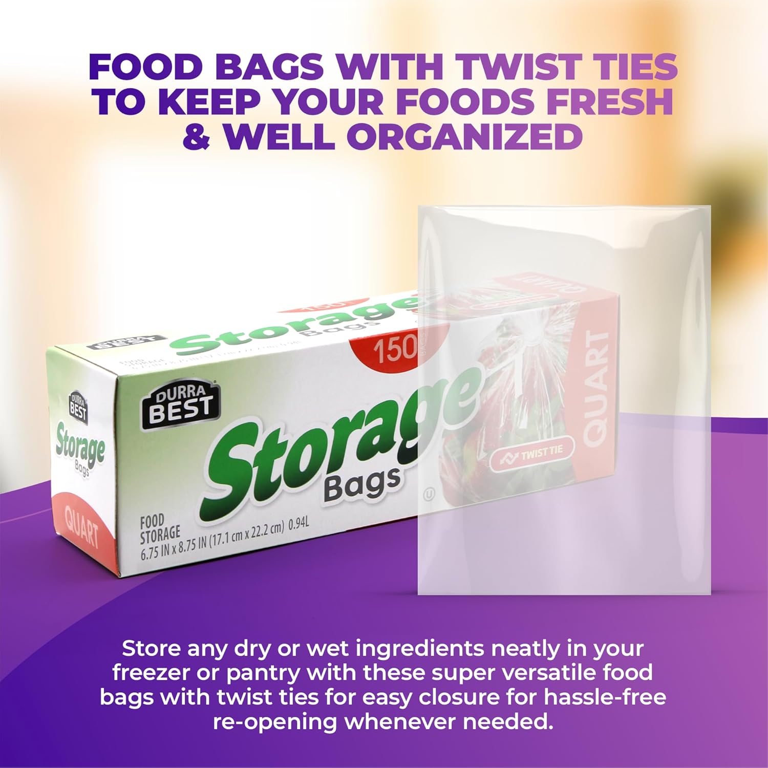 Quart Size Food Storage Bags with Twist Ties – 150 Count Clear Plastic Baggies for Bread, Snacks, Fruits, Nuts – Leak-Resistant, Food Safe, Disposable – by DURRA BEST