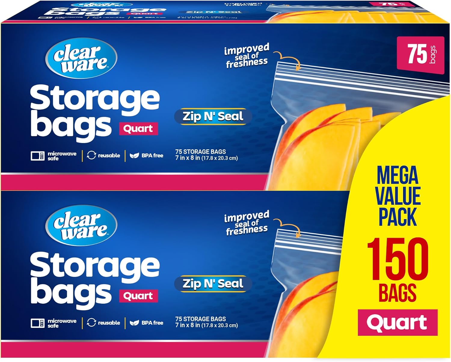 Quart Storage Bags, Double Zipper Seal – 150 Count, Resealable Thick Plastic Food Storage Bags – Microwave-Safe, Zero BPA – Reusable Containers for Lunch, Snacks, Meals – 2 Boxes