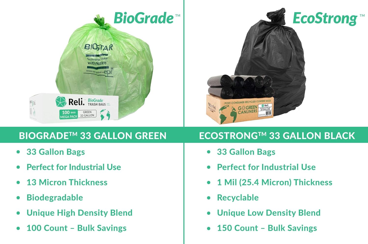 Reli. Biodegradable 33 Gallon Trash Bags, 100 Count, Green Eco Friendly, Degradable Under Certain Conditions, Custom-Fit for Compactor
