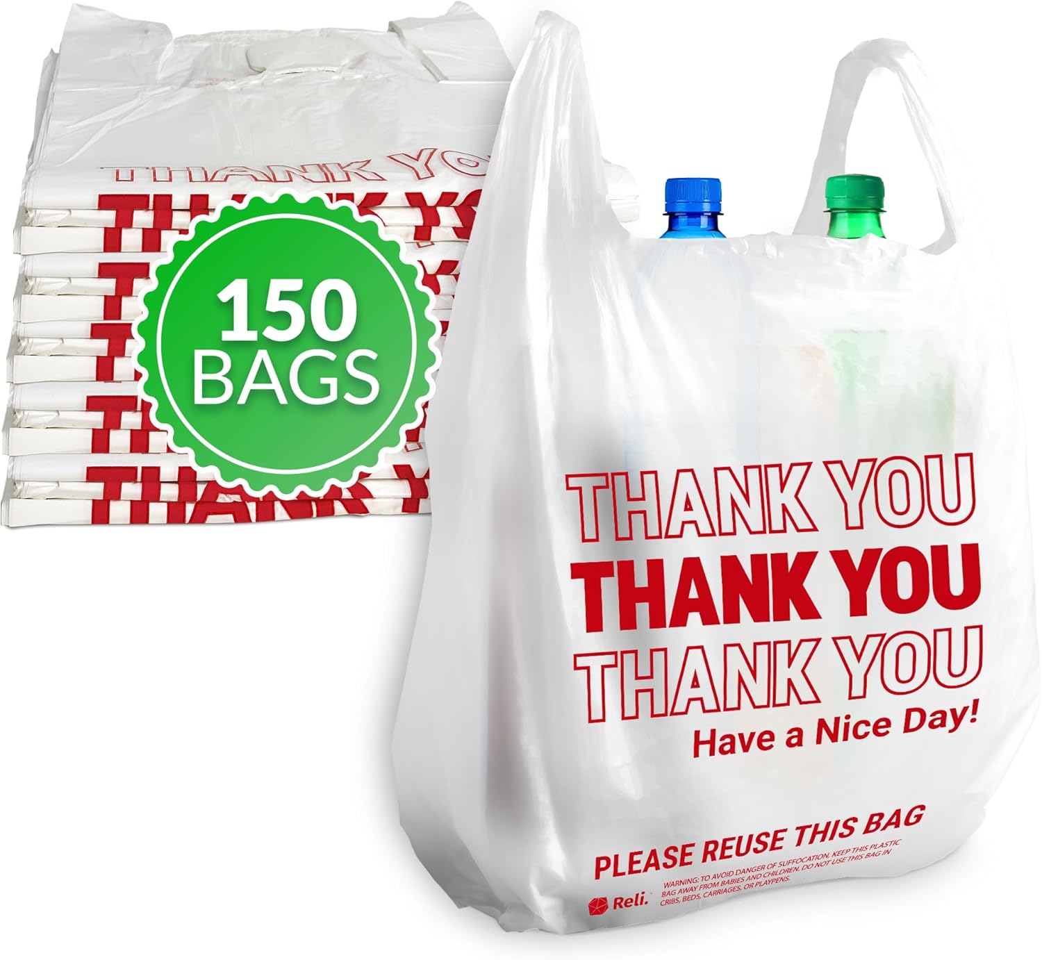 Reli. Thank You Plastic Bags | 150 Pack | (11.5″ x 6.5″ x 21″), White | Plastic Bags with Handles | Ideal for Grocery, Shopping, Food Take Out, Restaurants, Small Business