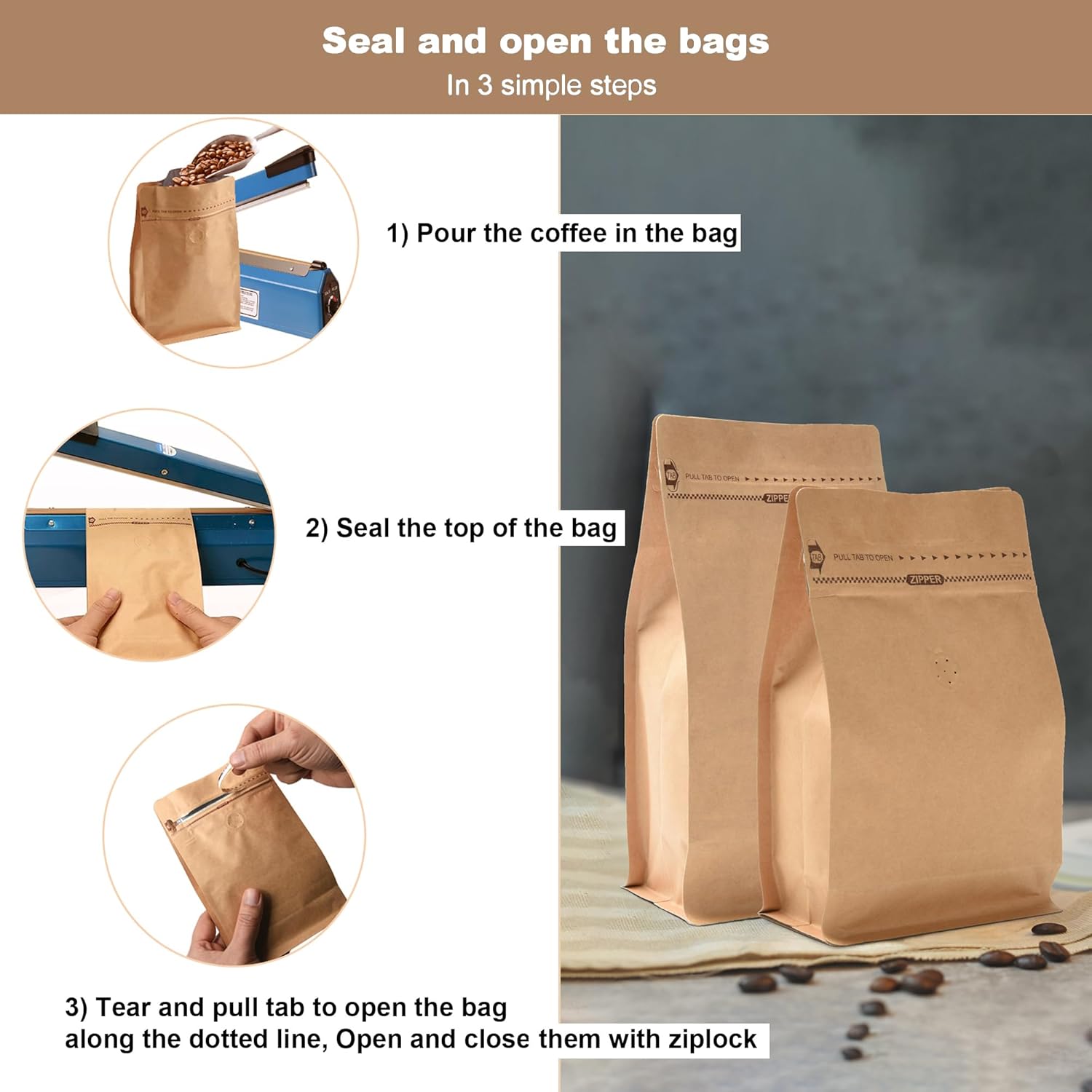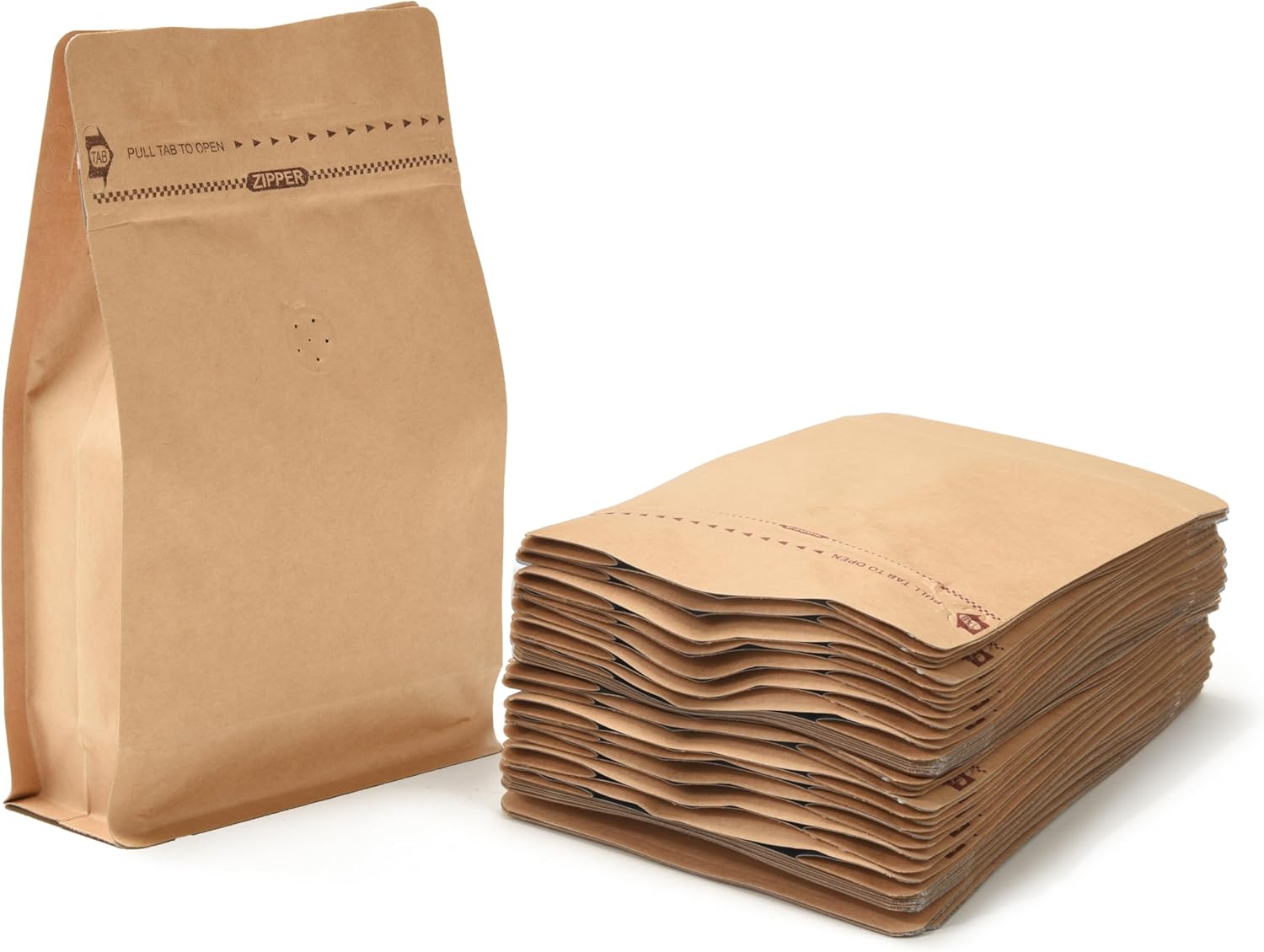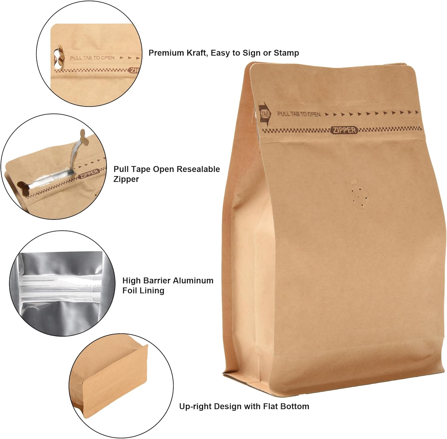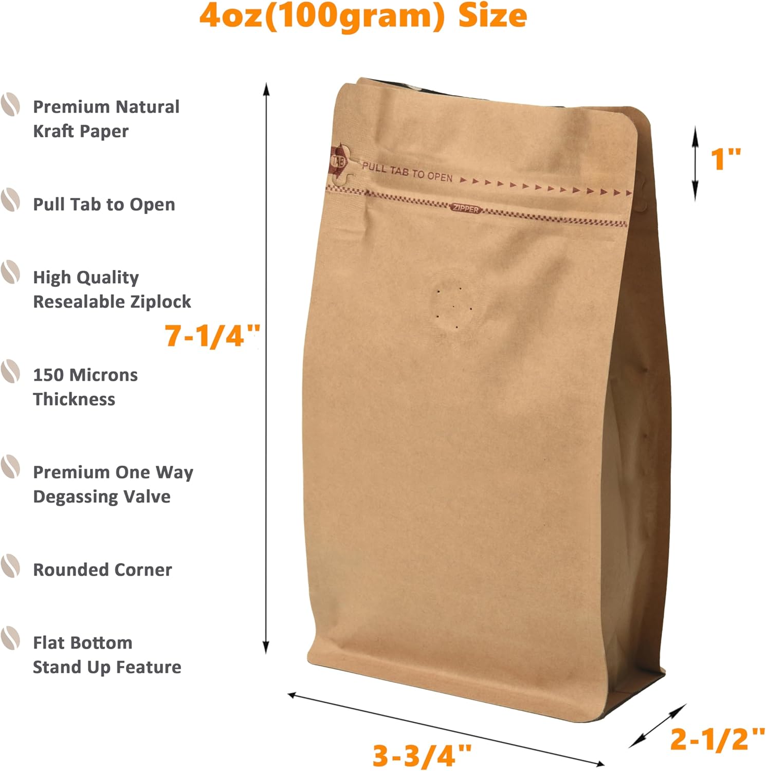 Resealable Side Zipper Coffee Bags with Degassing Valve, High Barrier Natural Kraft Coffee Pouches with Aluminum Foil Liner, Ziplock Food Storage Bags, Longer Shelf Life (50, 4oz/0.25lb)
