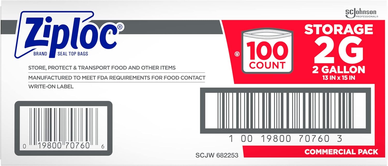 SC Johnson Professional Ziploc Brand Food Storage 2 Gallon Bags, Food Storage Ziploc Brand Bags, Commercial Pack, 100 Count Box, for Professional Use Only
