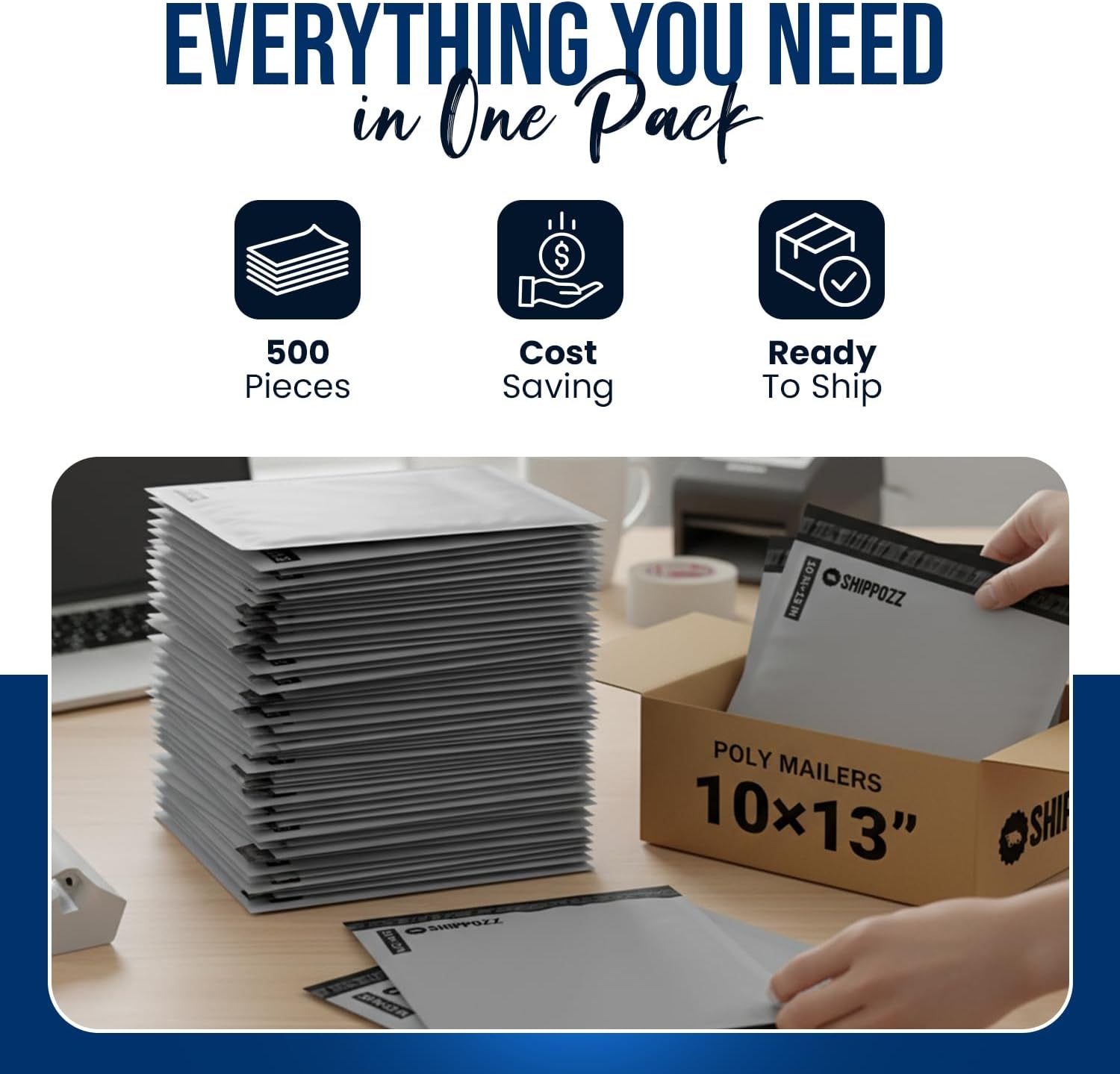 Shippozz 10×13 Poly Mailers 500 Pack, Durable Waterproof Polymailers for Shipping Clothes, Self Seal Mailing Bags for Small Business Packaging Supplies, Mailing Envelopes for Books, and Accessories