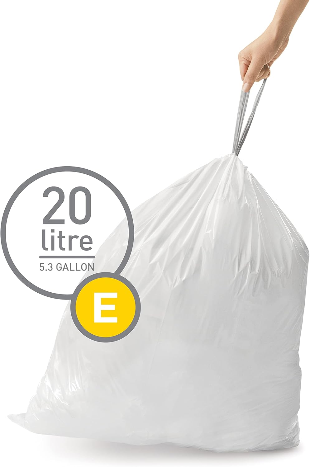 simplehuman Code E 60 Count, Dispenser Pack Custom Fit Liners, Drawstring Trash Bags, 20 Liter / 5.3 Gallon, White