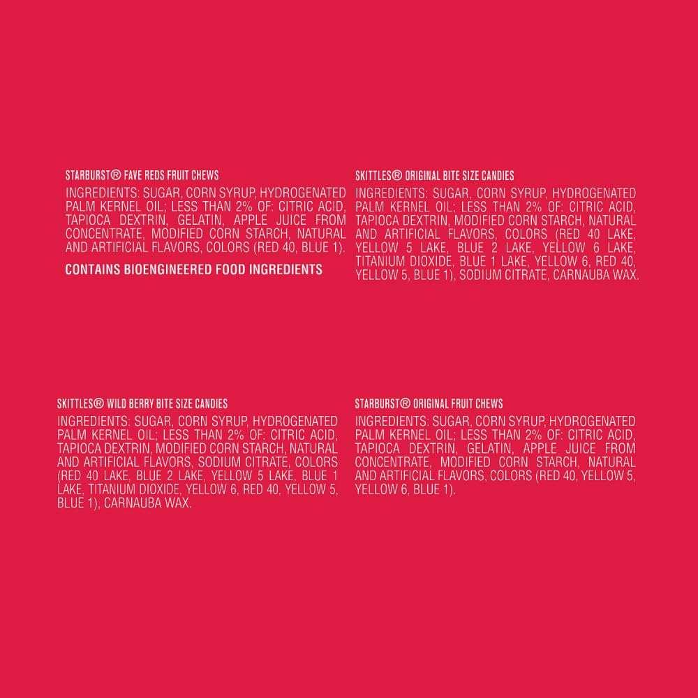 The only variety bag to chews! Four flavors of SKITTLES and STARBURST classics are all in one family size for you to enjoy! Stick your hand in this bulk bag of fun size individually wrapped packs and find SKITTLES Original, SKITTLES Wild Berry, STARBURST Original, and STARBURST FaveReds Chewy Candy. Make celebrations and special holidays extra sweet by filling candy buffets at baby showers, party favors, and piñatas for birthday parties, and gift baskets for Mother’s and Father’s Day with SKITTLES and STARBURST chewy candy. There is nothing like having your pantry at home stocked with a bulk variety bag of chewy candy. Not only are you able to keep your candy dish and snack drawer replenished, but you’ll also have sweet treats on hand for a sweet pick me up. Add our bulk assortment of SKITTLES and STARBURST chewy candy to your cart today!