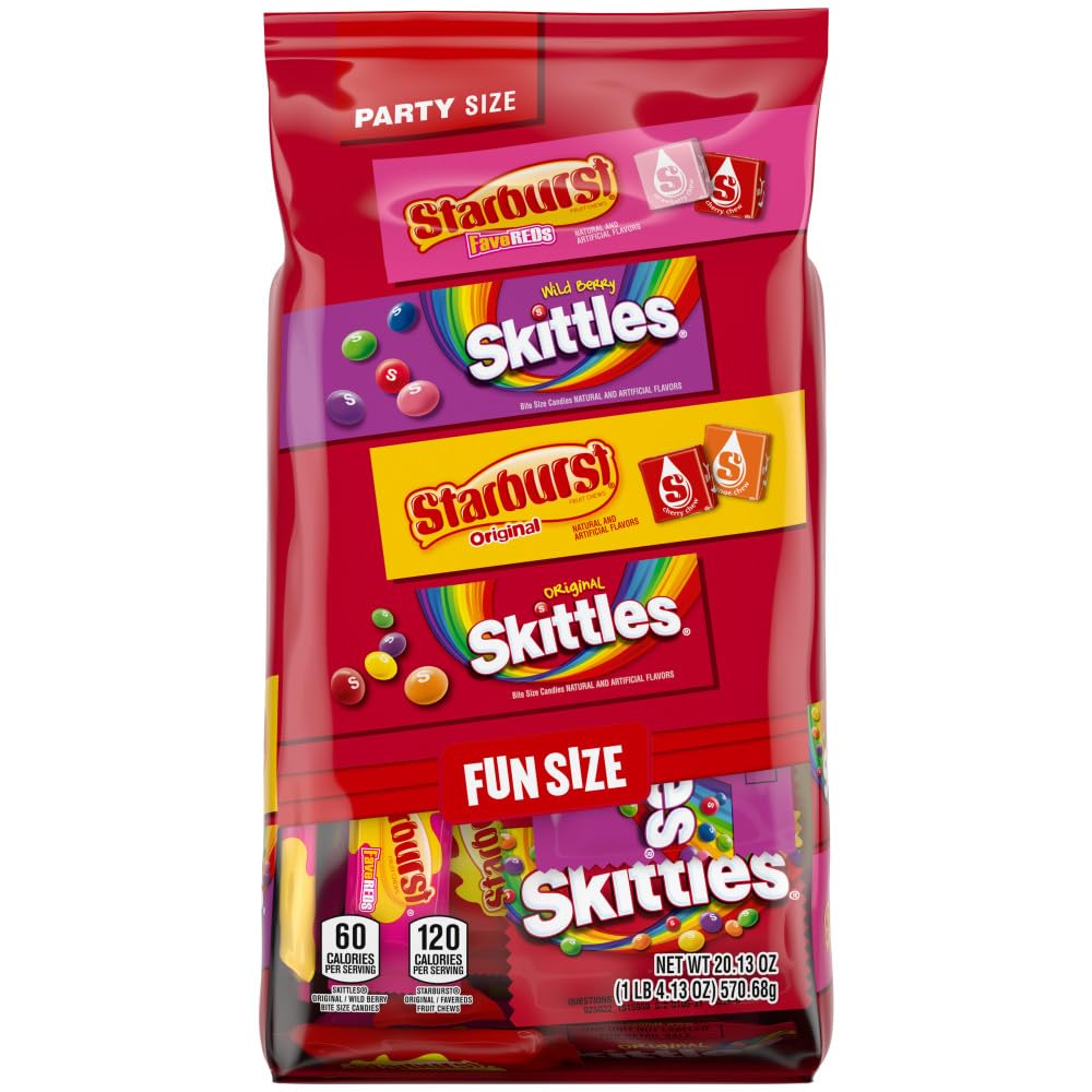 Contains one (1) 20.13-ounce party size bulk bag of SKITTLES & STARBURST Fun Size Chewy Candy Bulk Candy Bag