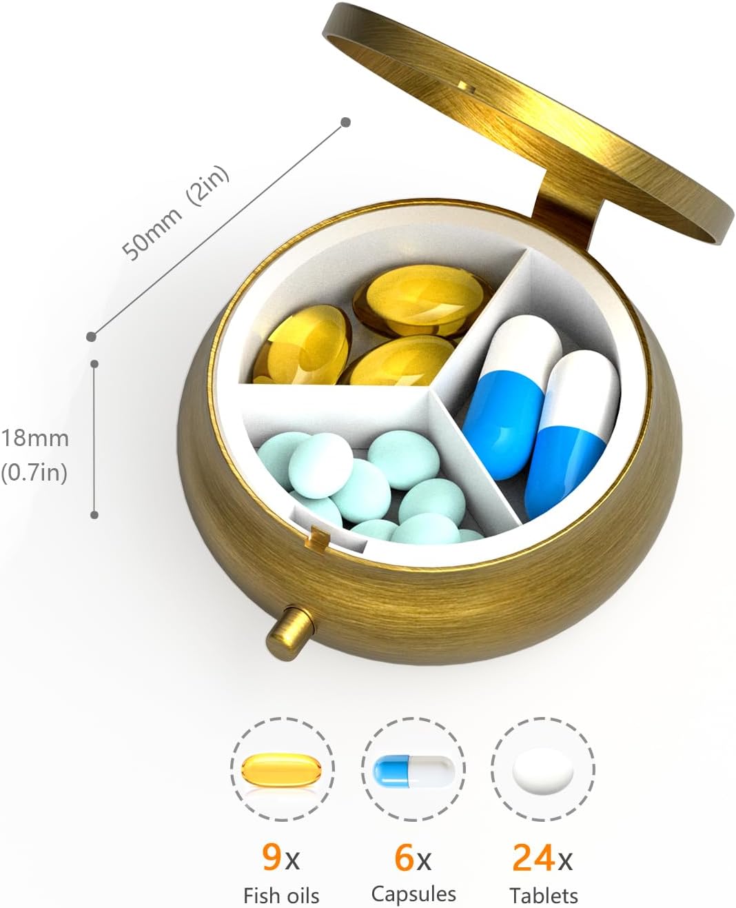 Portable Size: Our mini pill box has 3 compartments, measuring 2 inches in diameter and 0.69 inches in thickness. It is compact in size and light in weight, can fit right in the palm of your hand, takes up little space, and slides easily into your wallet and pocket, suitable for travel and daily use. Perfect to put in your purse, travel bag, briefcase, or the back pocket of your jeans for daily meds