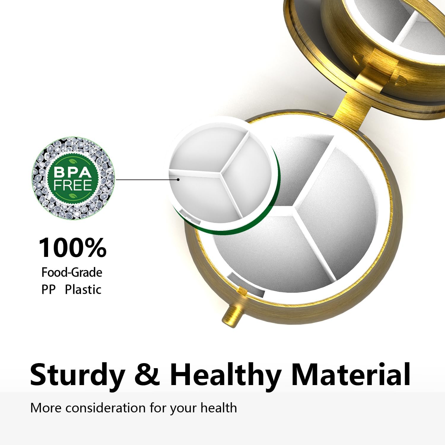 Premium Materials: Pill boxes high-quality metal used for the outer shell, more long-lasting and sturdy than plastic pill boxes, Food grade plastic used for inner compartments, perfectly prevents your pill from moisture and dust, Its durable metal hinge withstands over 10,000 bends