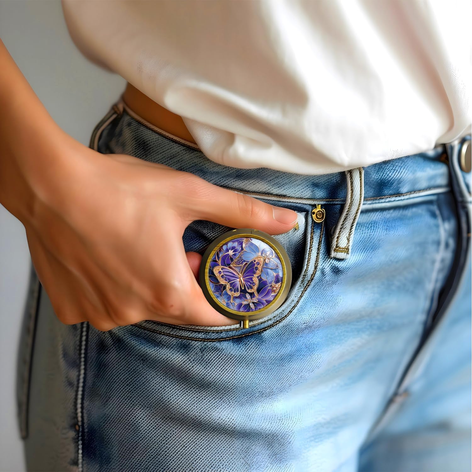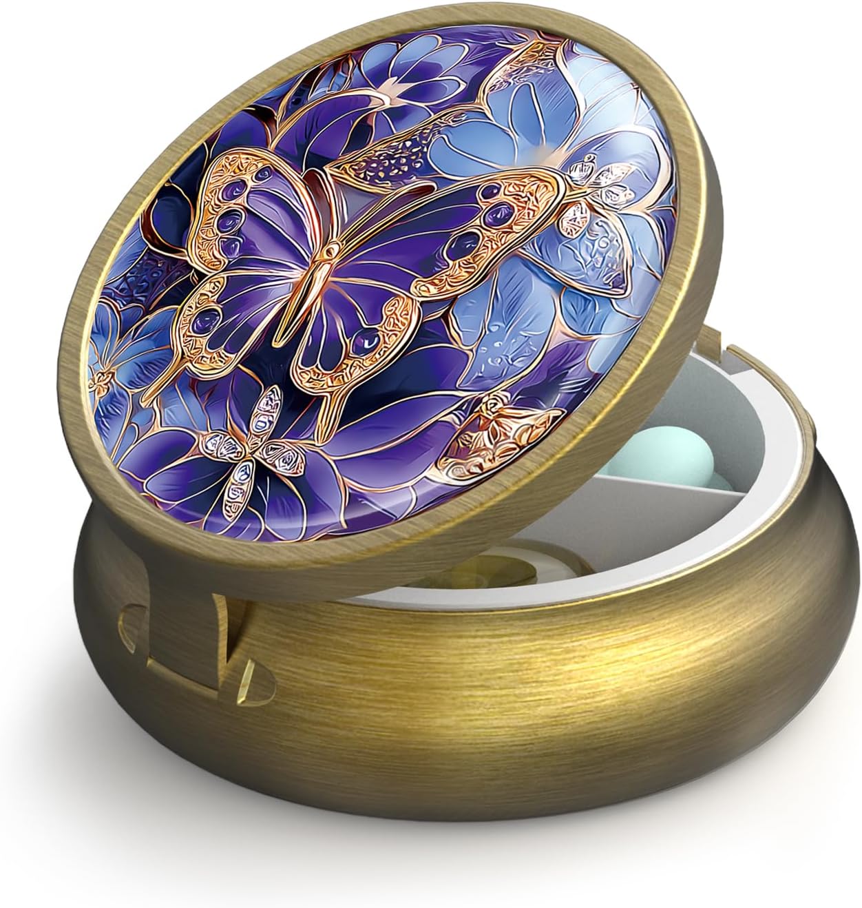 Small Pill Case Pill Box with Mirror Retro 3 Compartment Pill Holder for Purse or Pocket Bronze Portable Medicine Vitamin Container Fish Oil and Supplement Storage BPA-Free(Purple Butterfly)