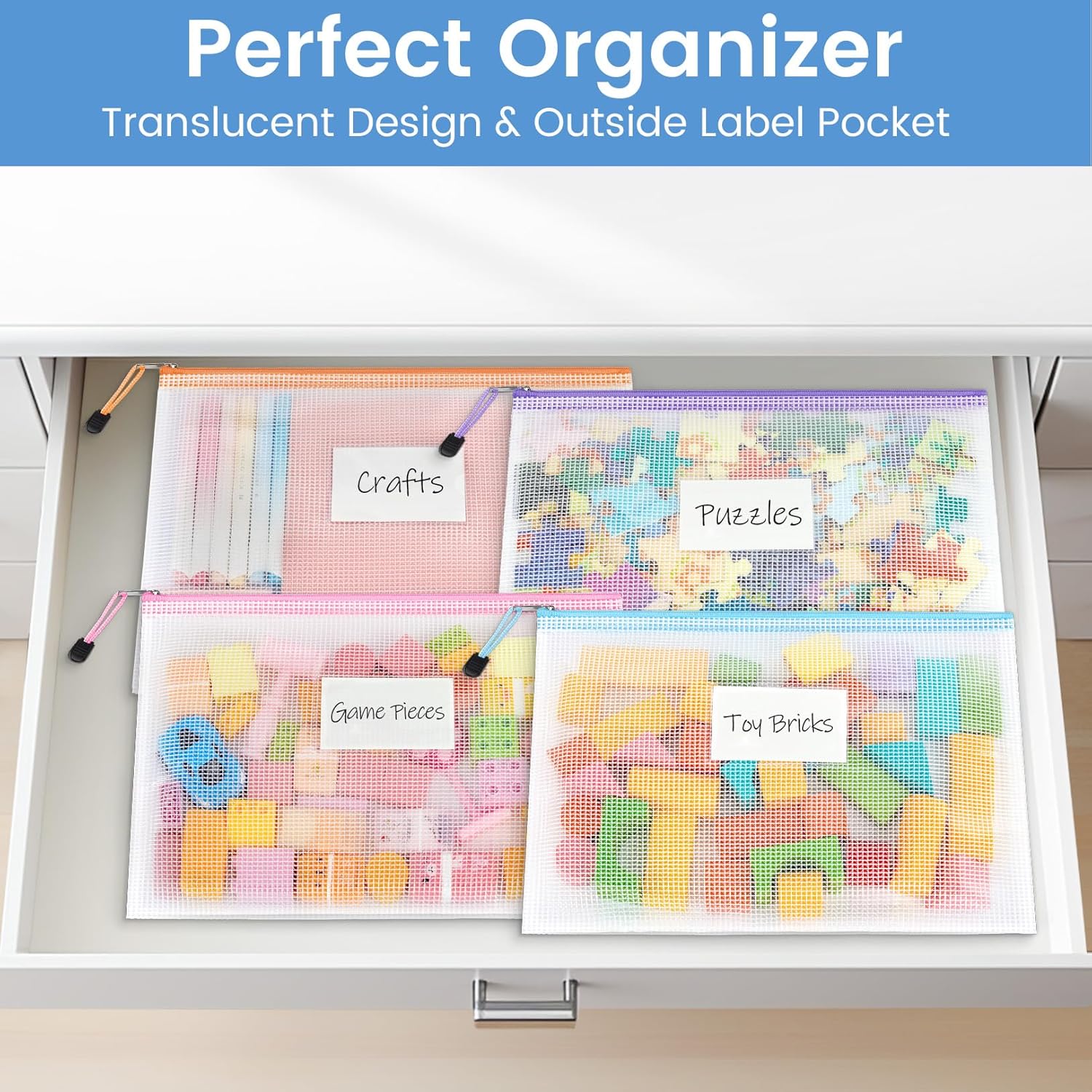 Zipper Pouches with Label Pockets: 20 Packs, 13.3″x9.4″ mesh zipper bags in 10 colors (2pcs for each color). An additional label pocket helps you more easily and quickly to find what you need, which makes our storage bags stand out better than other mesh bags.
