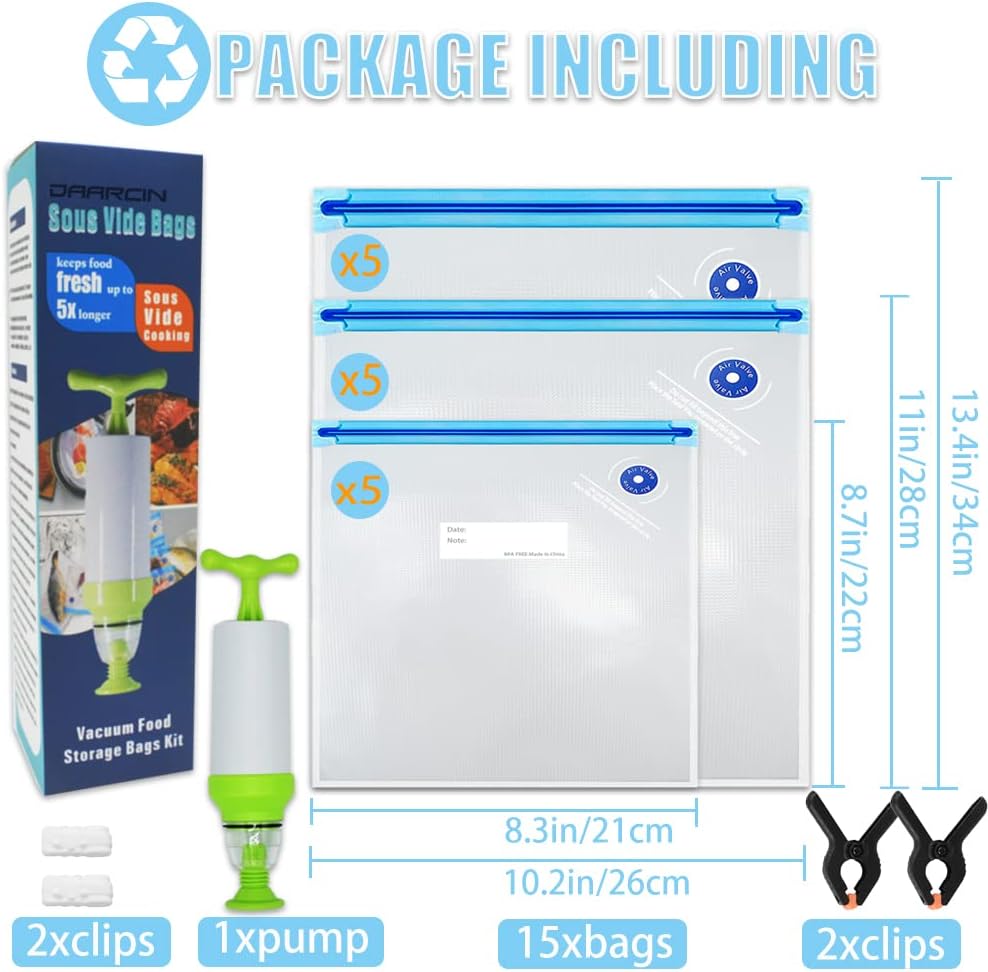 Sous Vide Bags 20pack Kit,Daarcin 3 Sizes Sous Vide Bag Kit with Pump-15 BPA Free Reusable Vacuum Sealer Bags-1 Hand Pump-2 Zipper Clips-2 Clamps for Food Storage and Sous Vide Cooking