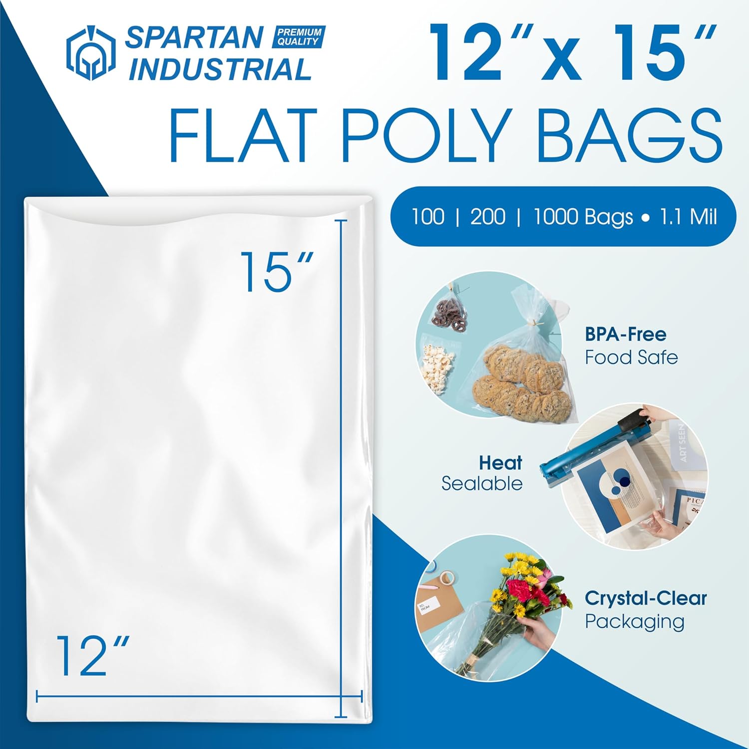 Spartan Industrial – 12” X 15” 1.1 Mil Flat Open End Clear Plastic Poly Bags – For Proofing Bread Dough, Packaging Clothes, Shirts (Thin & Lightweight – Bags DO NOT Have Seal)