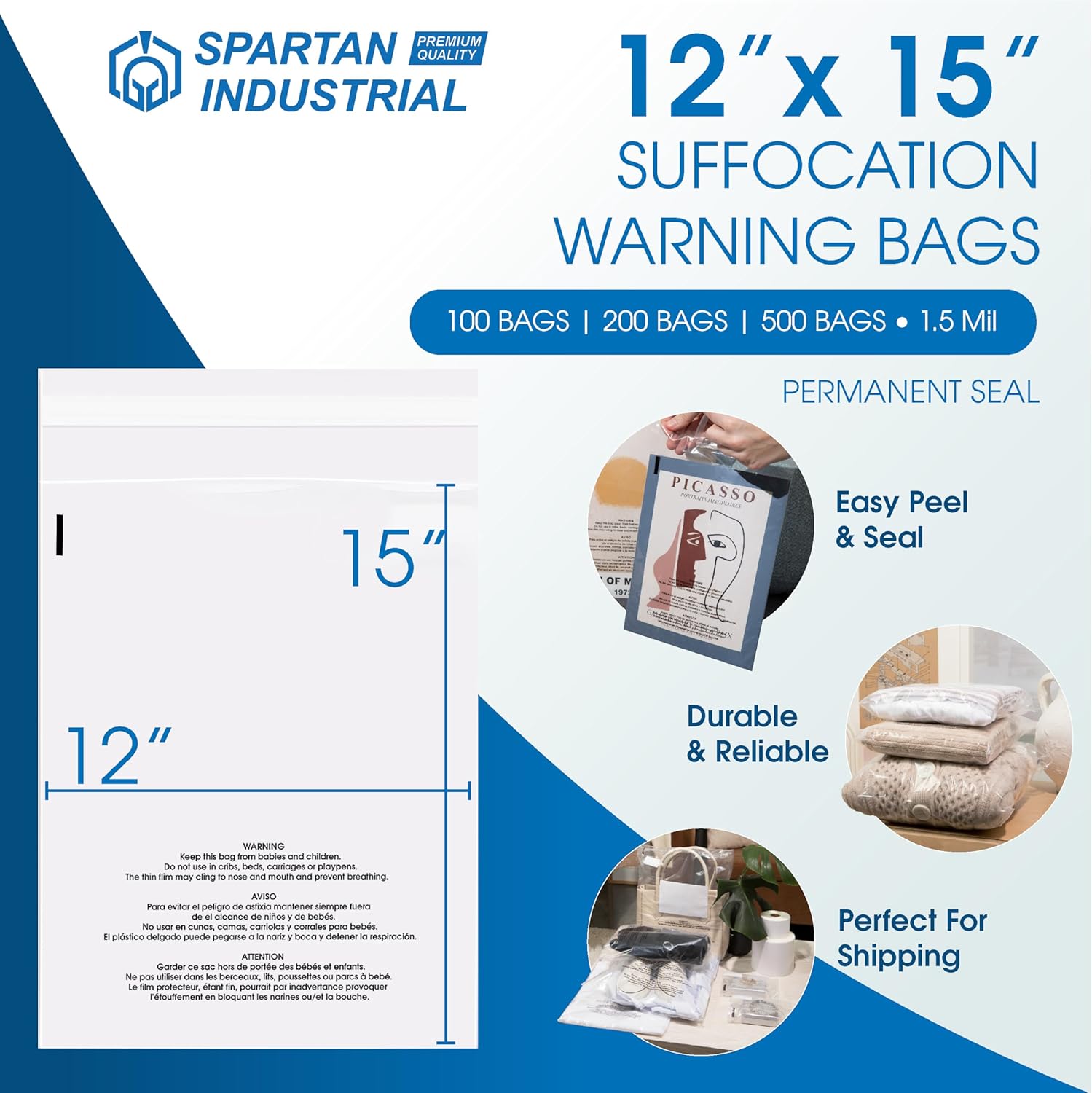 Spartan Industrial – 12” X 15” (200 Count) Self Seal Clear Poly Bags with Suffocation Warning for Packaging, T-Shirts & Clothing – Permanent Adhesive