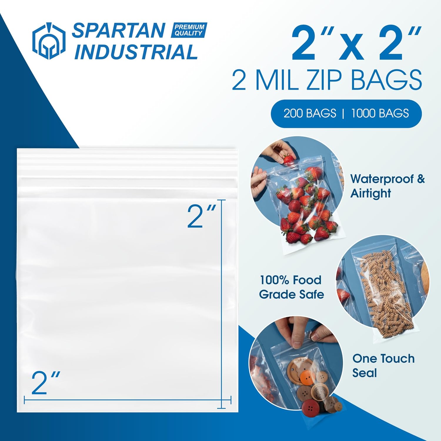 Spartan Industrial – 2” X 2” (1000 Count) 2 Mil Clear Reclosable Zip Plastic Poly Bags with Resealable Lock Seal Zipper