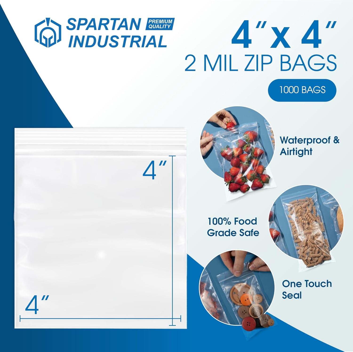 Spartan Industrial – 4” X 4” (1000 Count) 2 Mil Clear Reclosable Zip Plastic Poly Bags with Resealable Lock Seal Zipper
