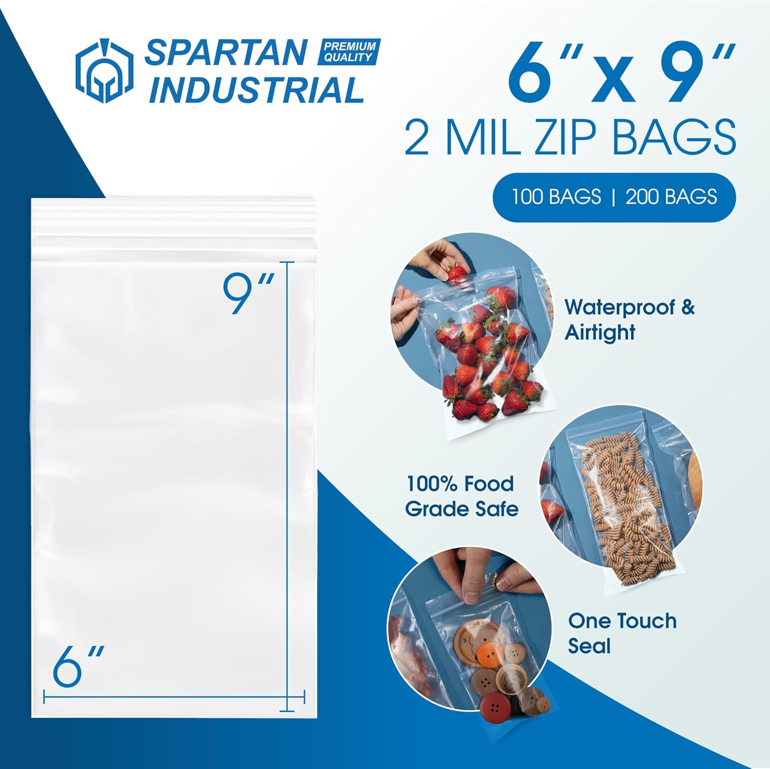 Spartan Industrial – 6” X 9” (200 Count) Quart Clear Reclosable Zip Plastic Poly Bags with Resealable Lock Seal Zipper – 2 Mil