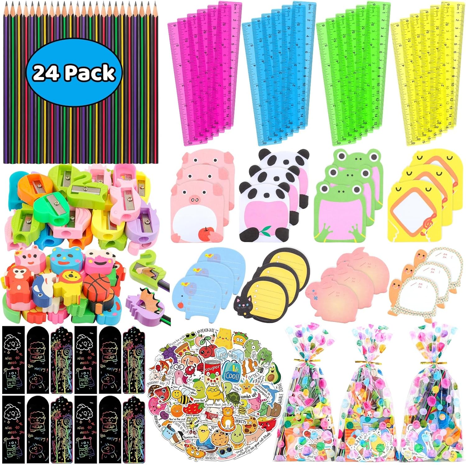 Stationery Party Favors, 24 Pack Birthday Goodie Bags for Kids with Pencils Rulers Sticky Notes Return Gifts Easter Stuffers Classroom Gifts Student Class