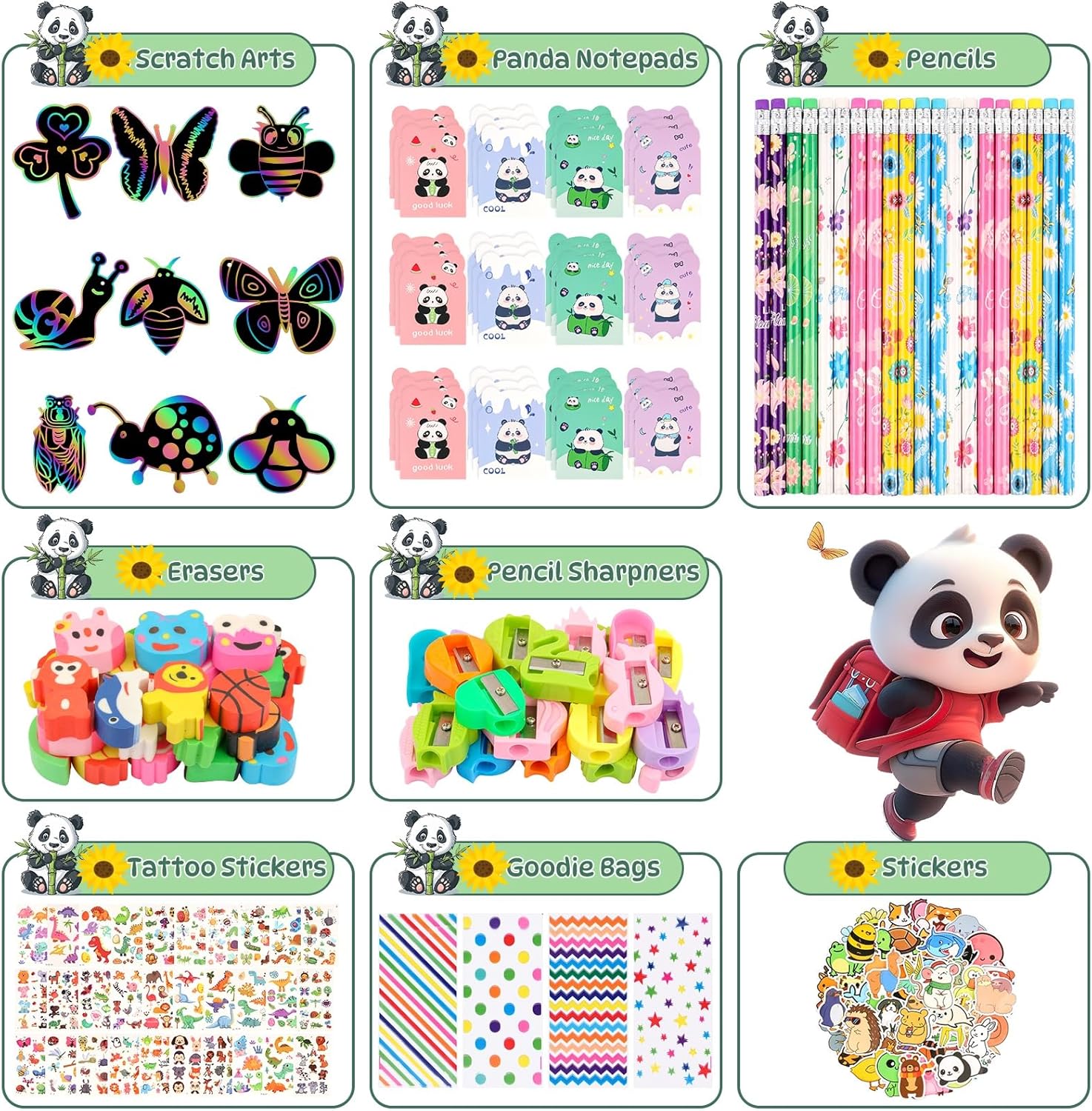 This 28-pack set includes a variety of classroom stationery essentials: 28 pencils, 28 erasers, 28 sharpeners, 28 panda notepads, 30 tatttoo stickers, 28 scratch arts set, 50 stickers and 28 goodie bags – everything needs for creative holiday fun at home, school, or during holiday gatherings.