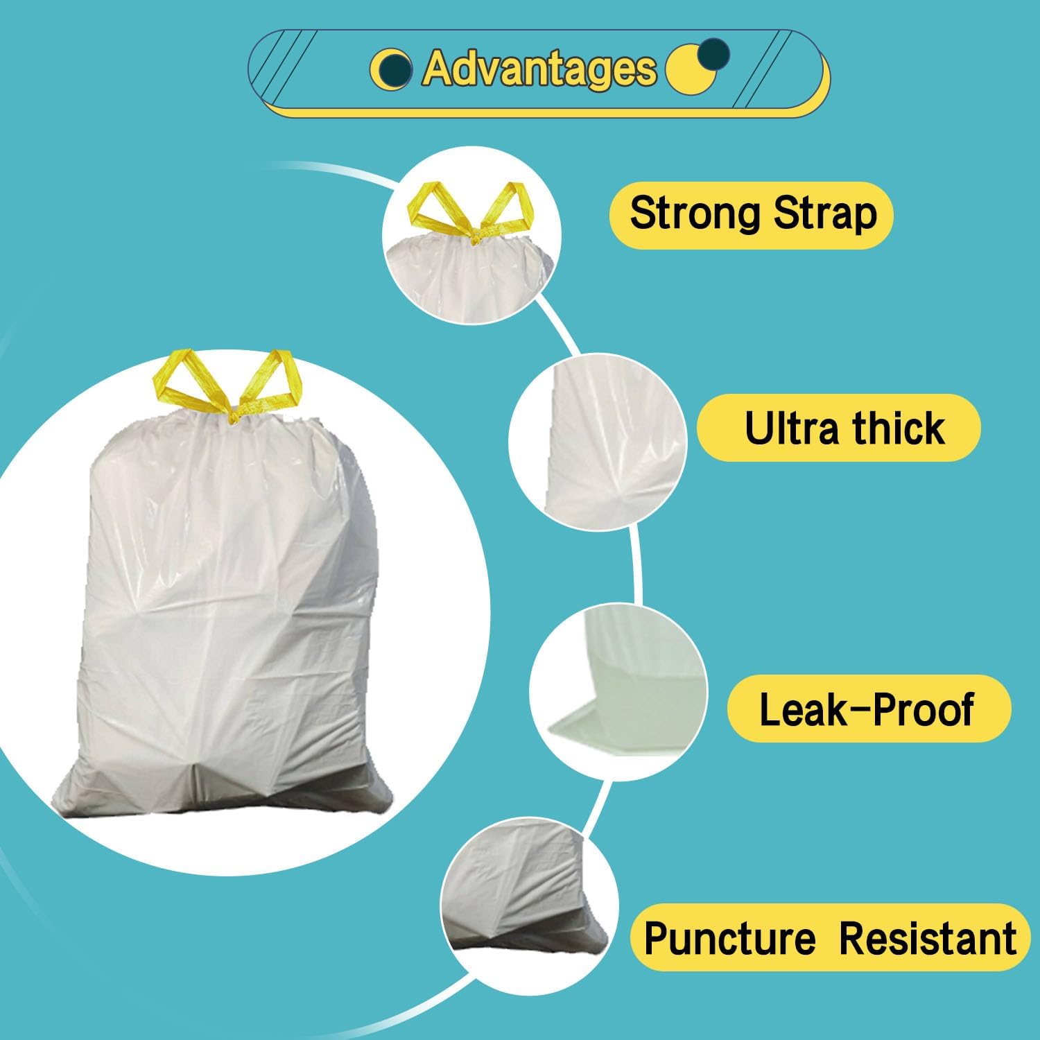 White 13 gallon trash bags with yellow drawstring closure for easy tying and carrying