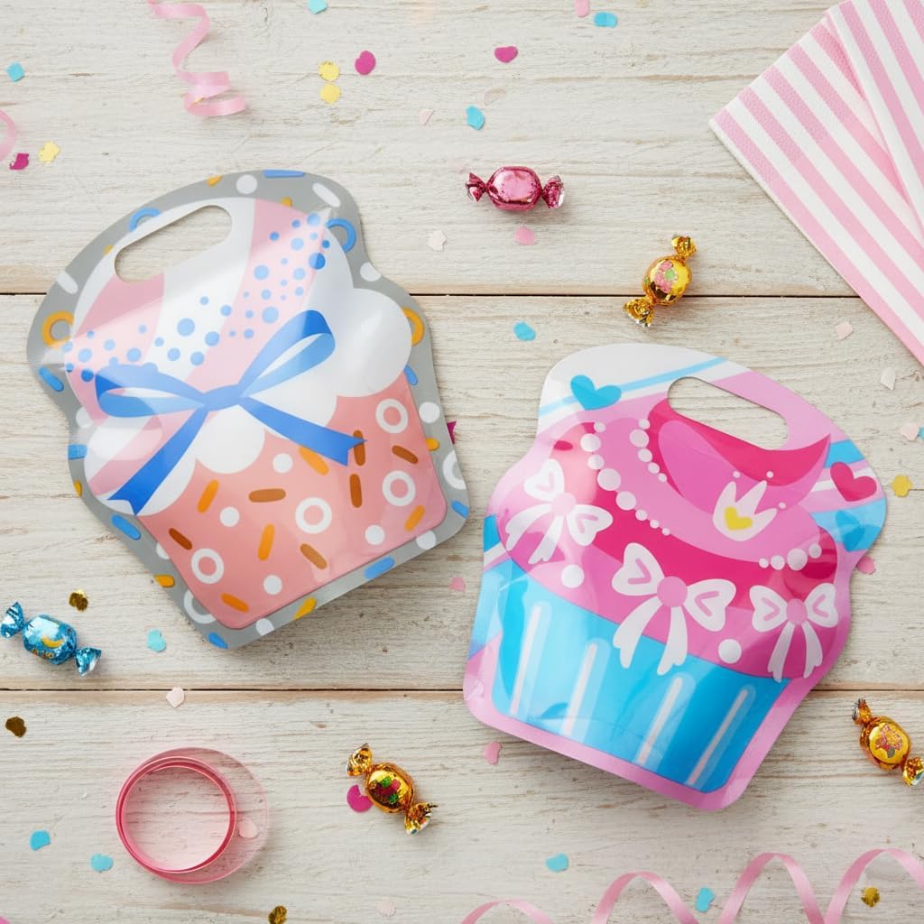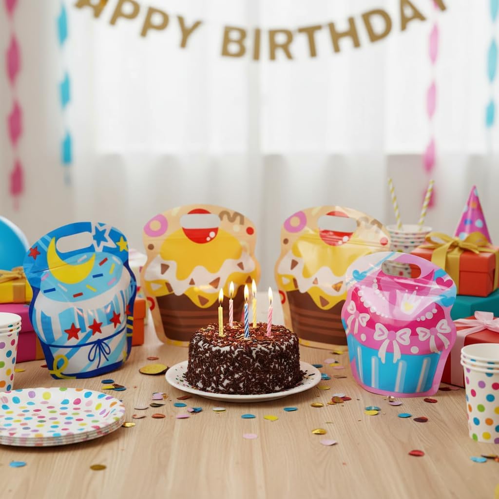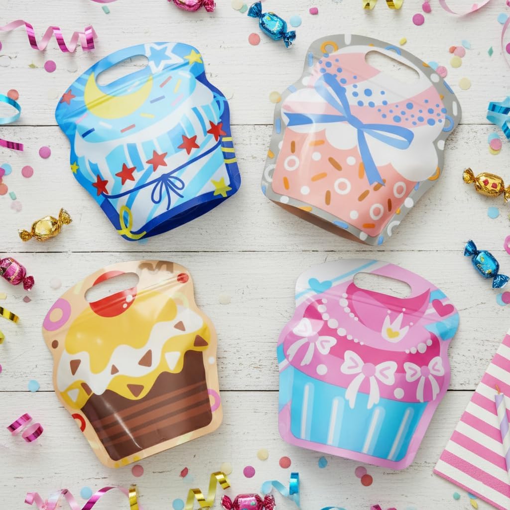 SUNCOLOR Party Favor Bags, 28 Pack Plastic Gift Bags with Self-Sealing Closure, 7.9×7.1×2.8 Inches, 4 Cupcake Designs, Single-Sided Transparent for Kids Birthday Goodie Bags