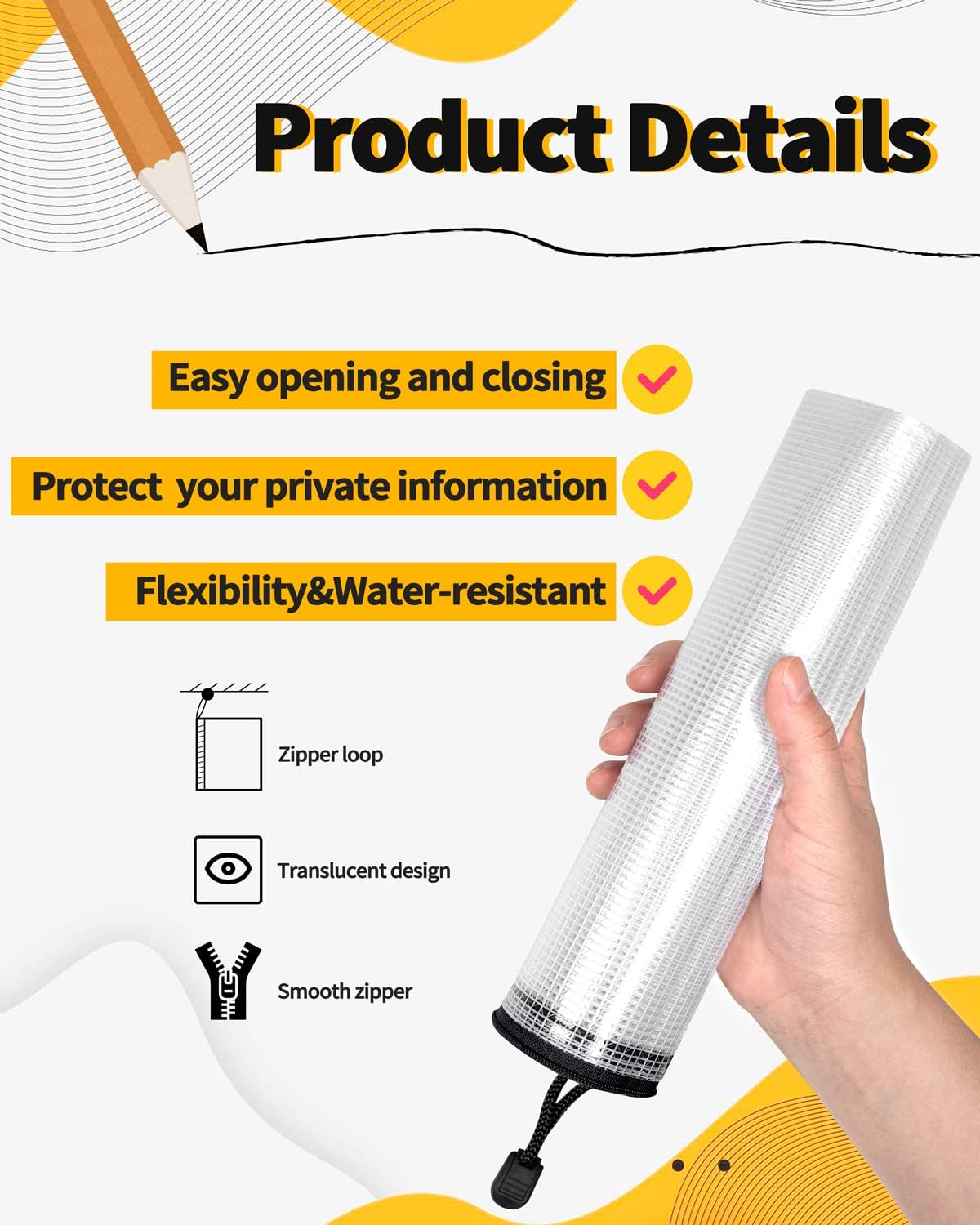 1 Ample Capacity 2 Rugged & Soft 3 PVC Material 4 Smooth Zipper