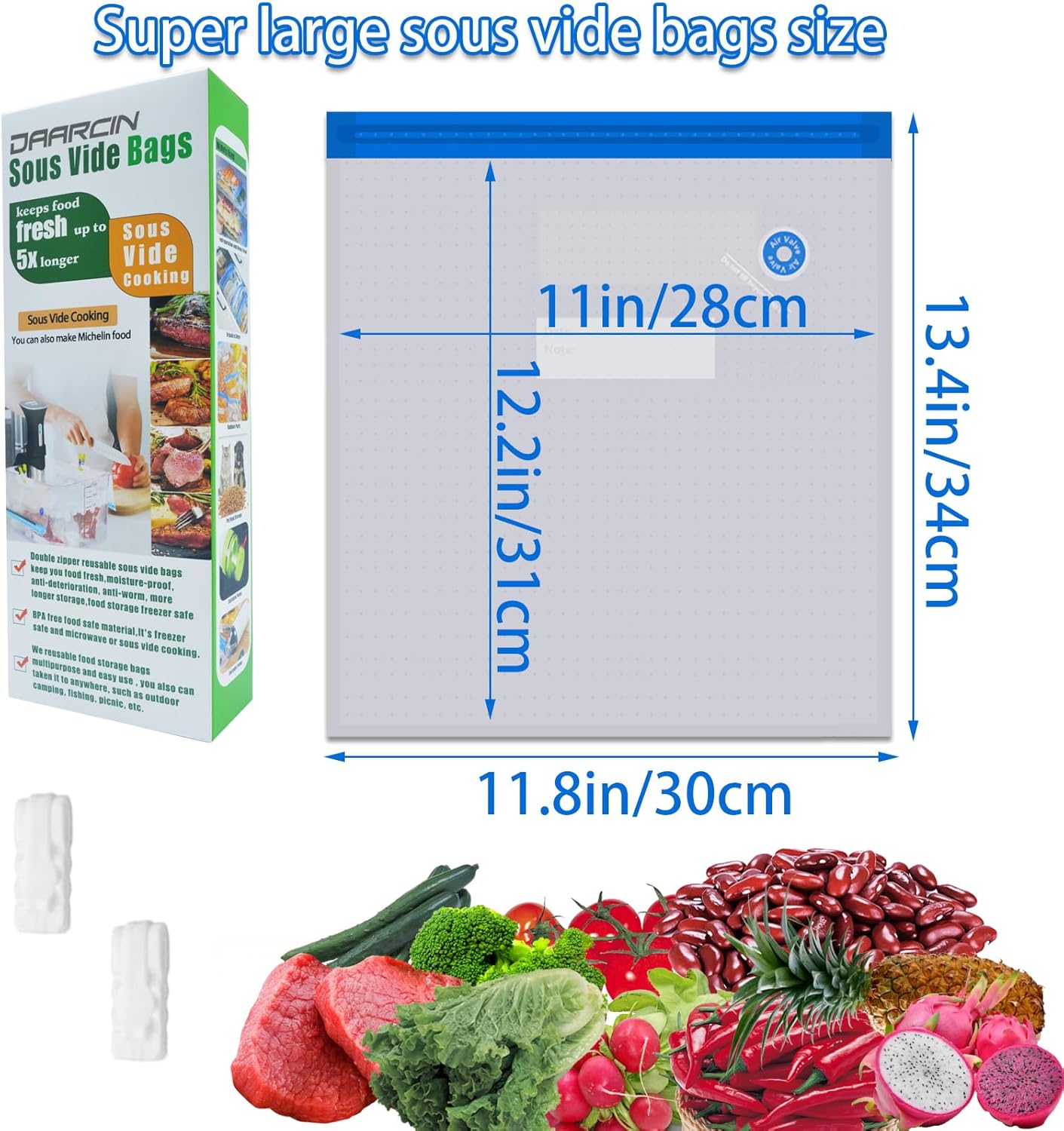 Super Large Size Sous Vide Bags:13pcs 11.8×13.4in/30x34cm big size reusable sous vide bags,2pcs bag sealing clips,keep you food flesh,moisture-proof, anti-deterioration, anti-worm, more longer storage,food storage freezer safe