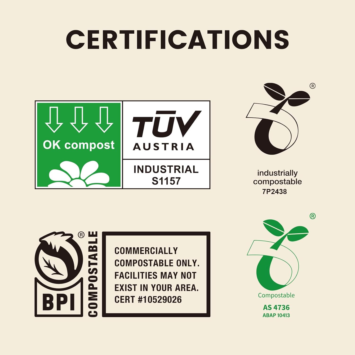 Certifications: SUPERBIO bags has been awarded official certificates from Biodegradable Products Institute (BPI) (Commercially Compostable Only) and OK compost INDUSTRIAL, SEEDLING from TÜV, meeting ASTM D6400 and EN 13432 standard