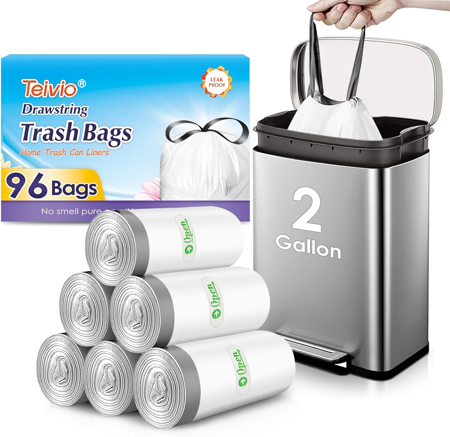 Teivio 2 Gallon 96pcs Strong Drawstring Trash Bags Garbage Bags, Bathroom Trash Can Bin Liners, Small Plastic Bags for Home Office Kitchen, White