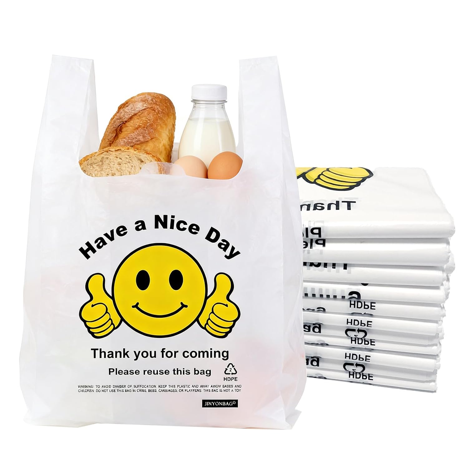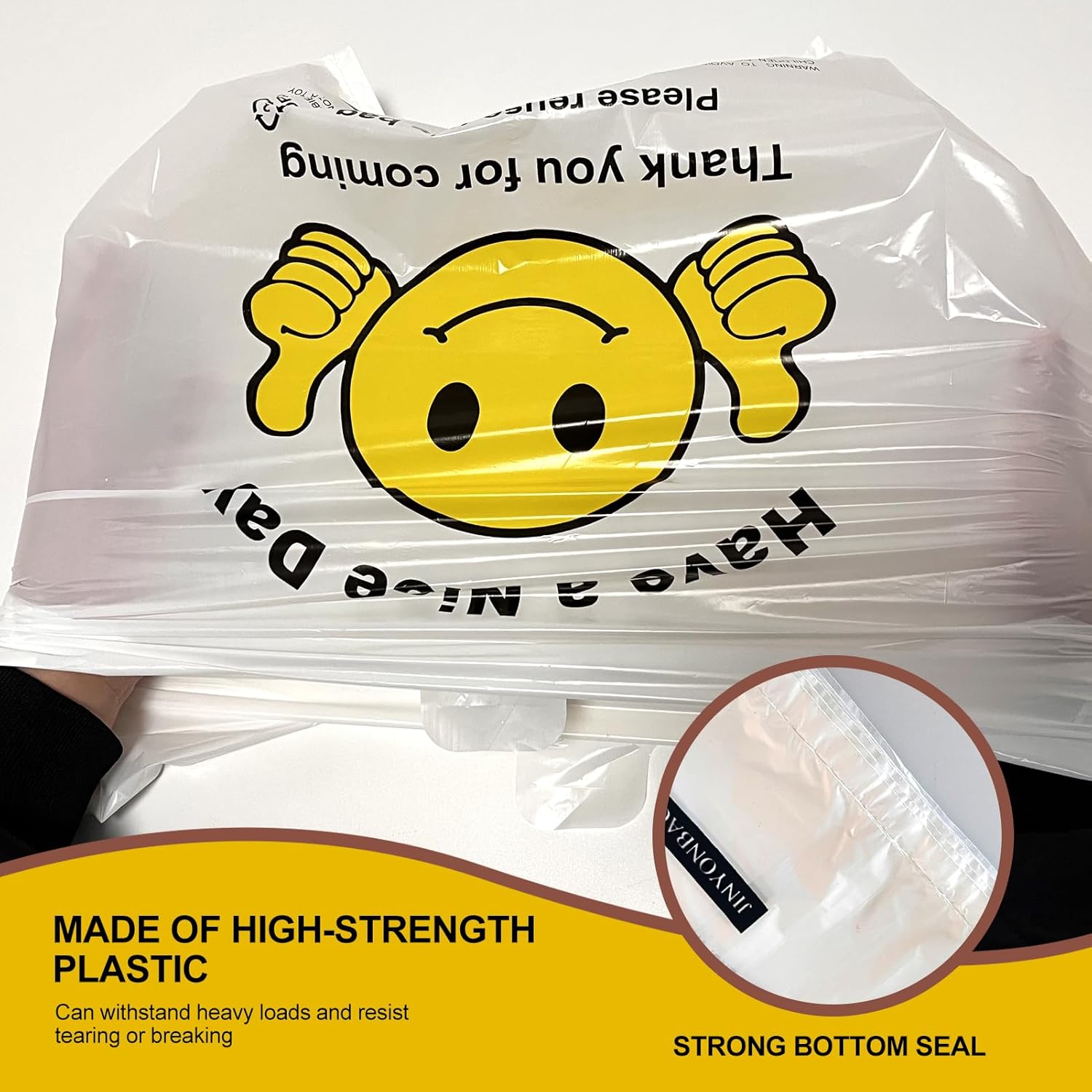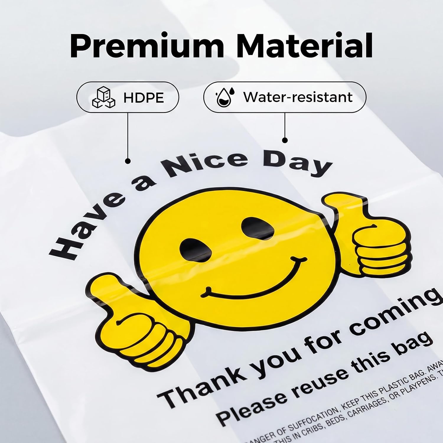 Cheerful Smiley Thank You Design – Each bag features a bold “Thank You” message with a smiley thumbs-up graphic, creating a friendly, welcoming touch that enhances customer satisfaction while keeping your retail or small business packaging professional.