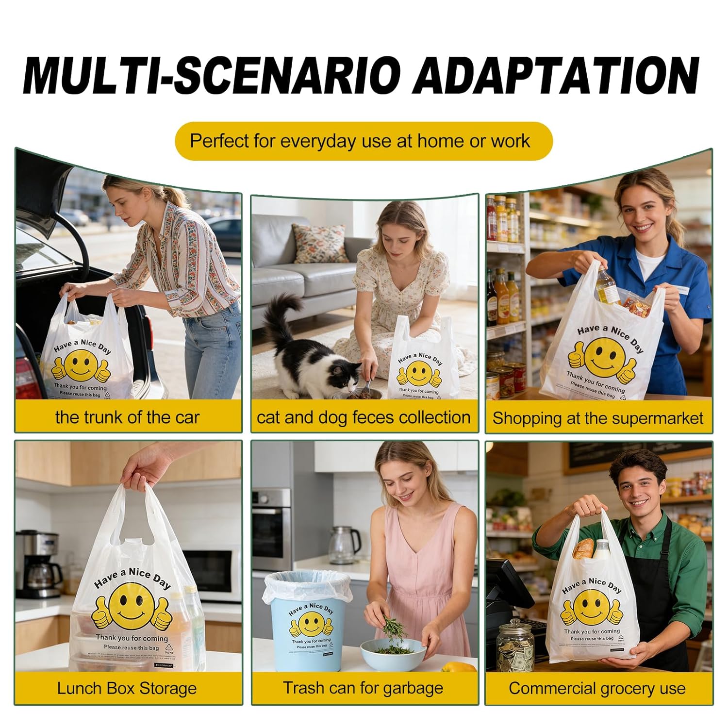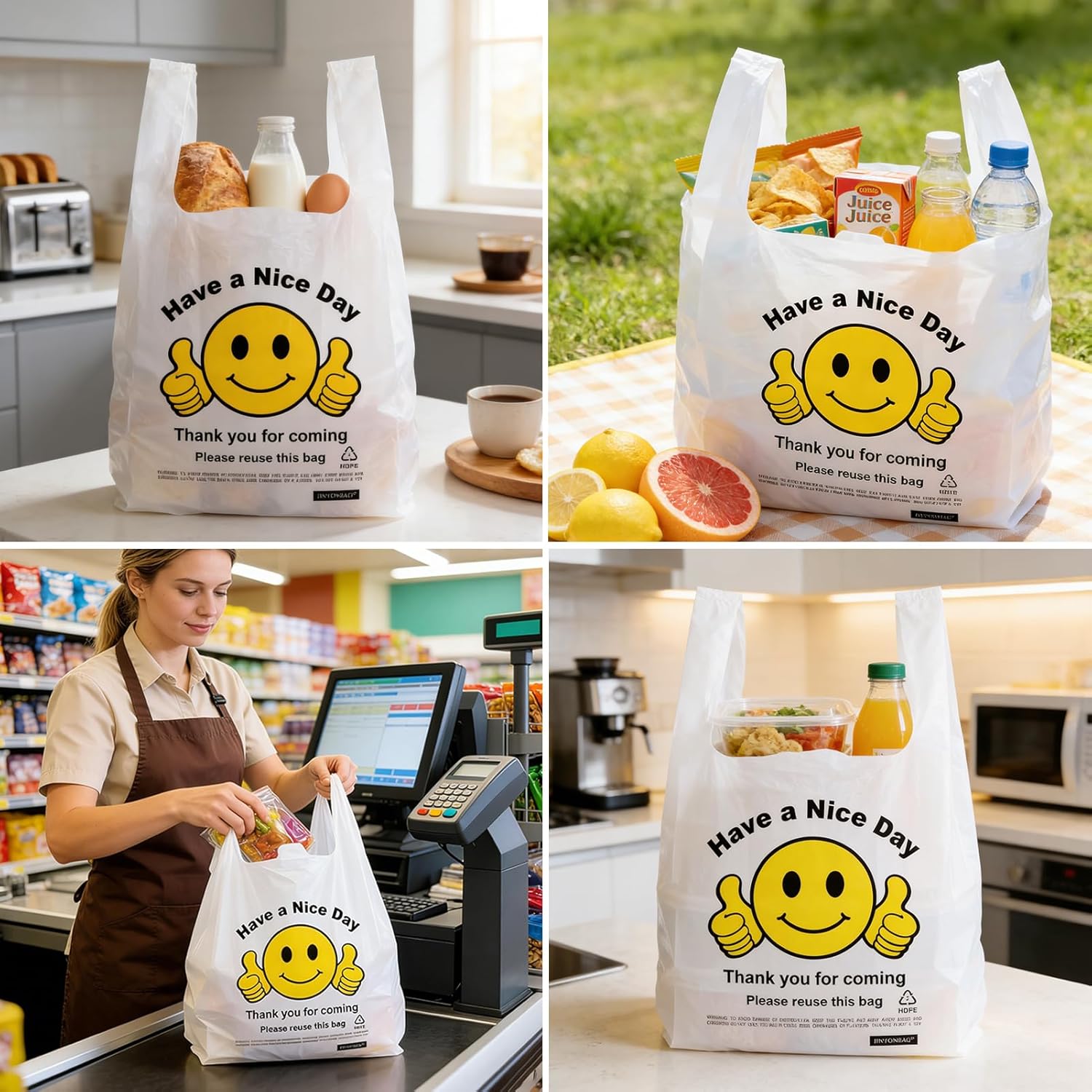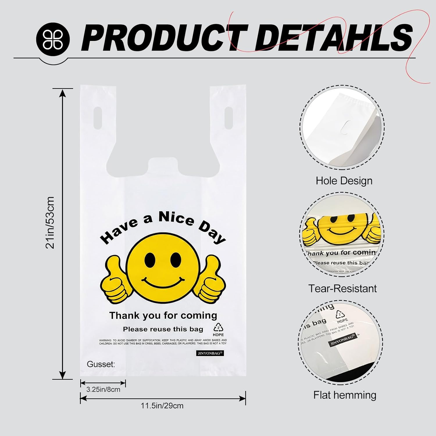 Cheerful Smiley Thank You Design – Each bag features a bold “Thank You” message with a smiley thumbs-up graphic, creating a friendly, welcoming touch that enhances customer satisfaction while keeping your retail or small business packaging professional.