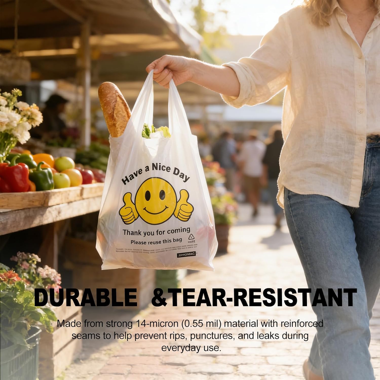 Durable 14-Micron HDPE Construction – Made from 0.55 mil high-density polyethylene, these plastic grocery bags are stronger than standard thin bags, making them perfect for safely carrying groceries, boxed goods, or takeout items.