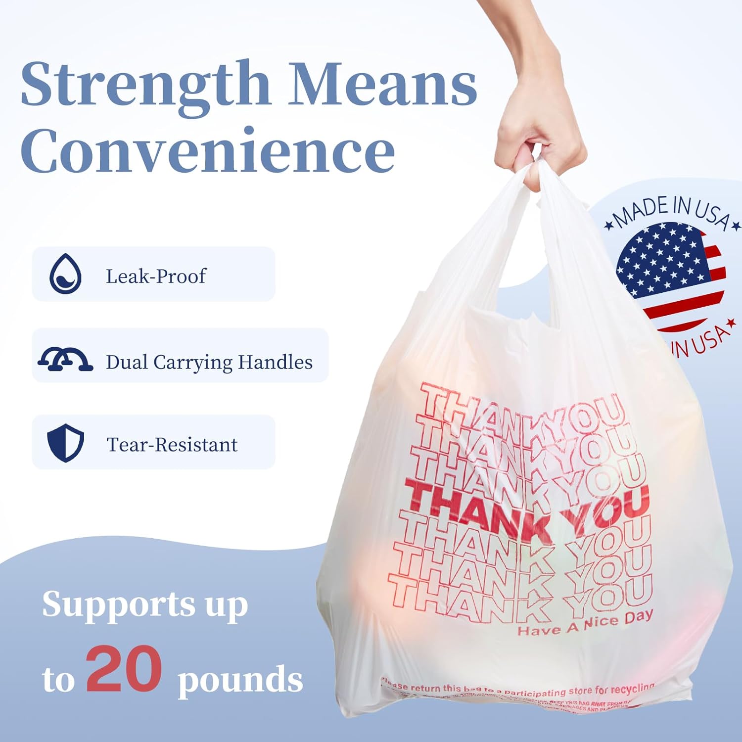 Durable & Tear-Resistant – Crafted from high-density polyethylene (HDPE) with a 0.47 mil thickness, these bags offer superior strength and tear resistance. Whether packing heavy groceries, retail items, or takeout orders, they remain intact without ripping, ensuring reliable performance for businesses and customers alike.
