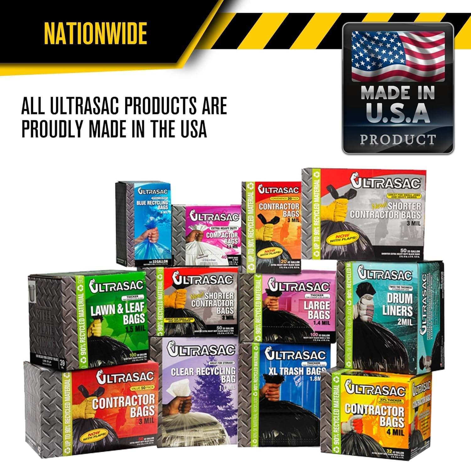 What’s included: Shorter Contractor bags by Ultrasac – Count: 50Size: 39″ by 32″Gauge: 3 MILCapacity: 33 GallonsAdditional info: – Made from at least 90% recycled plastic. – Includes external twist ties (NOT flap ties) – Made in the USAUltrasac contractor bags are made from at least 90 percent recycled material. Made with premium resins. Bags are gusseted and individually folded, open easily and are packed in cube style dispenser cartons for easy storage in tight quarters. Commercial Quality at affordable prices for every job. Packed for value oriented retail sale. Made in America. Easy to store in glove compartments, RV’s, trailers or motorcycles. 33 gallons capacity. Measures 39-inches length by 32-inches width.